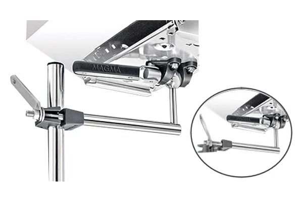 LeveLock Vertical Round Rail Mount by Magma®. This mount combines the versatility of popular “LeveLock”™ all-angle quick release, cam-action mount for instantaneous leveling, with sturdy vertical, out-over-the-water Round Rail Mount. This mount is made entirely of 18-9 stainless steel and 356 anodized aluminum to outlast even the most severe marine environments. Quickly disassembles for stowage without tools, leaving no hardware on the rail.