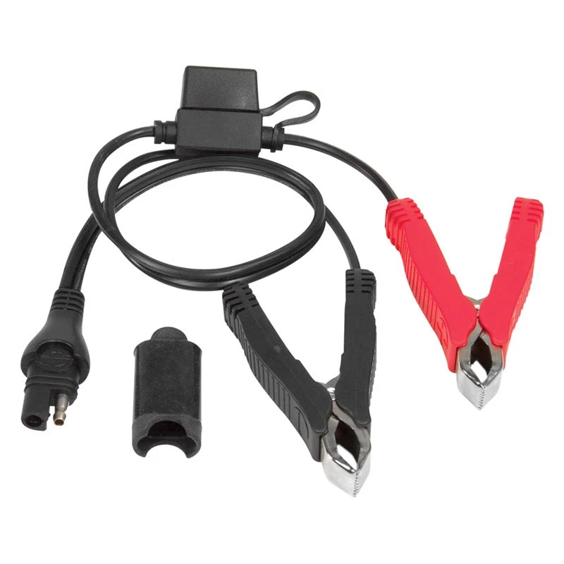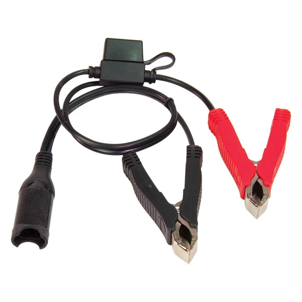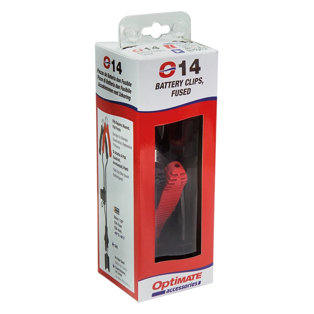 Universal Cable Series Battery Clips (O-14) by OptiMate®. With 15A fuse. Custom designed battery clips to fit all batteries. Battery clips with ‘easy grip’ rubber handles, custom designed to fit round, square (power sport) and flat tab posts.
