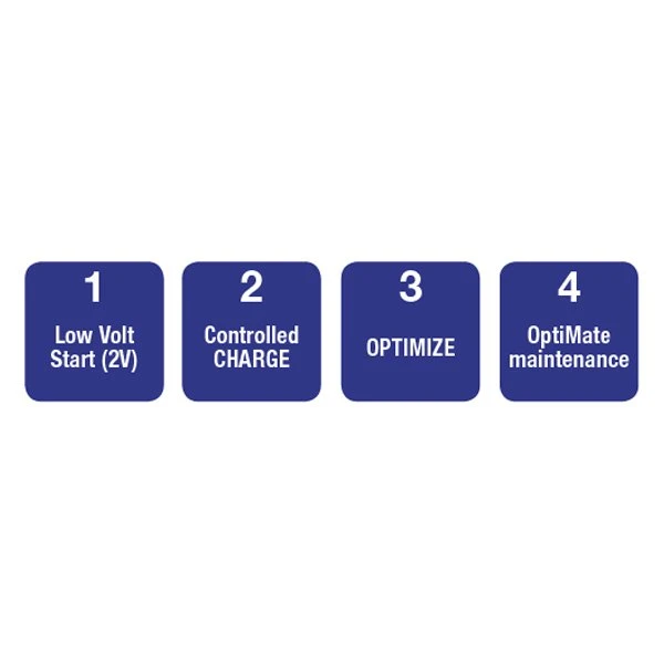 OptiMATE 2™ 12 V Compact Battery Charger and Maintainer by OptiMate®. Advanced 12V battery maintenance. OptiMATE 2 extends life and improves performance of a 12V battery, mounted in a vehicle / craft or battery operated system that is not in daily use, even in temperatures below freezing. OptiMATE 2 senses the battery condition, recharges and then keeps the battery 100% ready and provides power to the anti-theft alarm, display, on board computer, etc. The OptiMATE maintenance program delivers only what the battery needs, never overcharges, never undercharges.