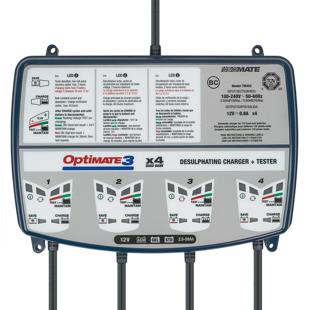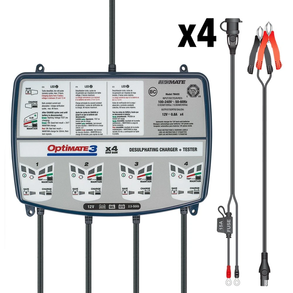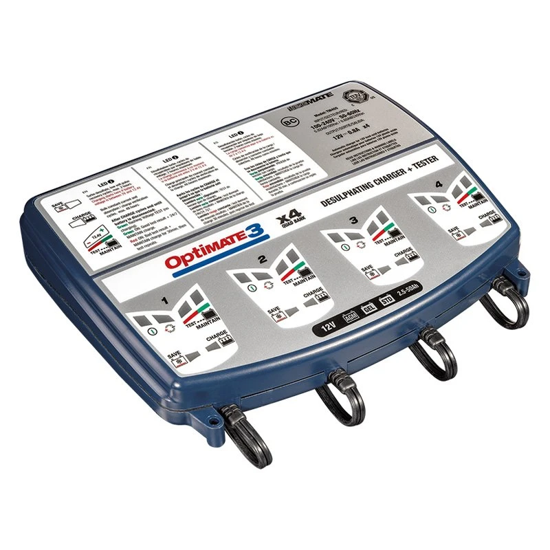 OptiMATE 3 x 4™ 12 V Compact 7-Step Automatic Battery Charger and Tester with Maintainer by OptiMate®. OptiMate 3 x 4, the all-in-one tool for 4 x 12V batteries care at home, in the workshop or in the vehicle storage facility. Diagnoses, recovers, charges, tests and optimally maintains, automatically. The OptiMate 3 x 4 retains all easy-to-use characteristics of the over 2 million OptiMates produced since 1995, but is now lighter and more efficient than ever and it cares for 4 batteries simultaneously and independently. The OptiMate 3 x 4 recovers sulphated batteries and then tests after charging. The maintenance program delivers only what the battery needs, never overcharges, never undercharges.