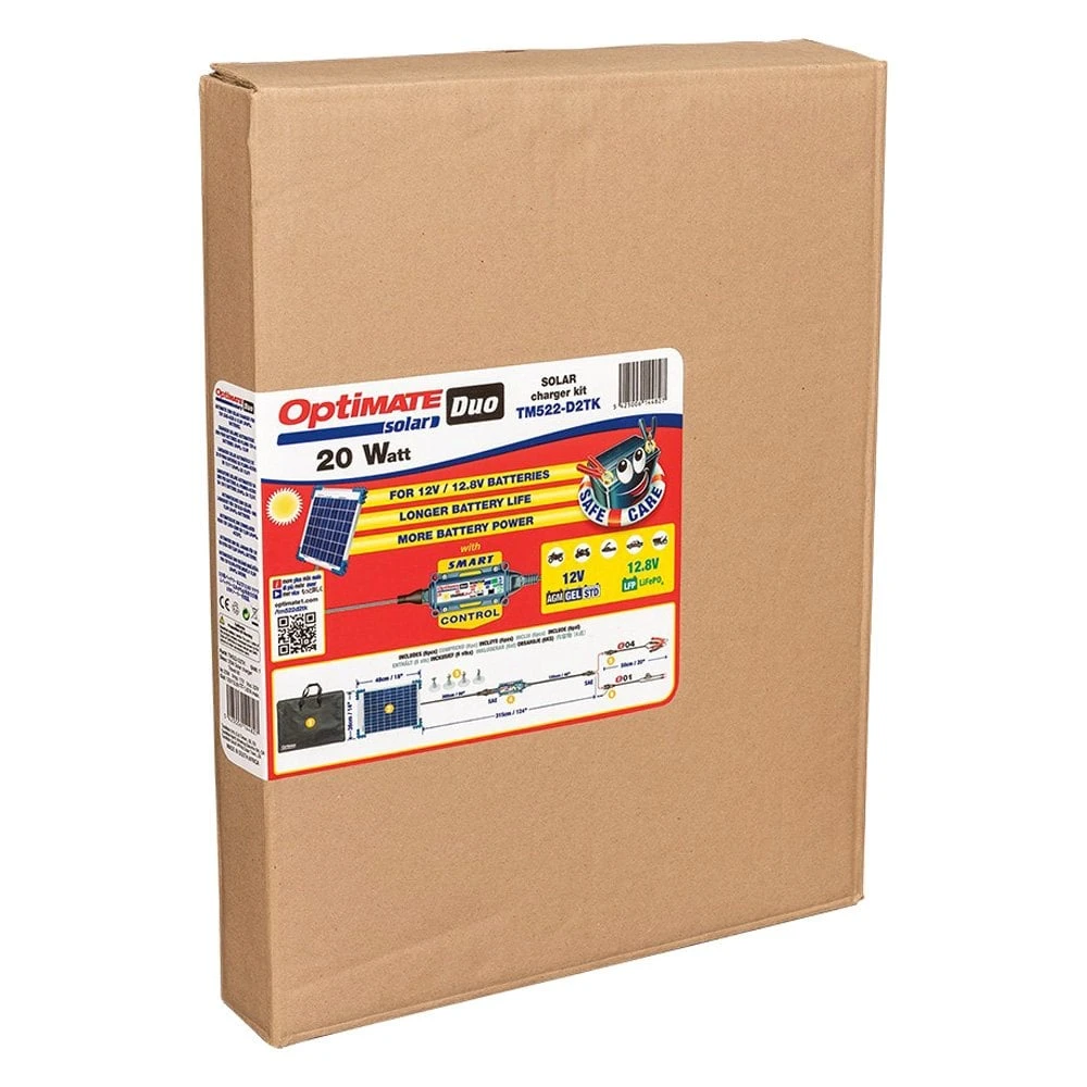 - The smart charge controller automatically adjusts charge according to battery type and condition – OptiMate Solar DUO’s smart control guarantees longer battery life and more battery power!