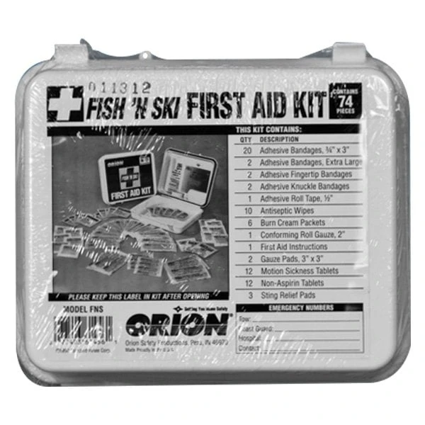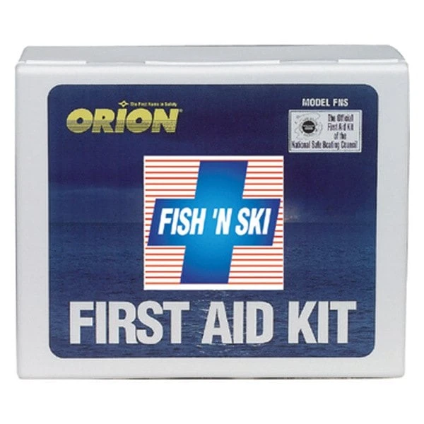 Fish N Ski First Aid Kit by Orion Signal Products®. The perfect marine first aid kit for the small craft. Plastic case with gasketed dual locking lid, fits easily into small storage areas on boat.