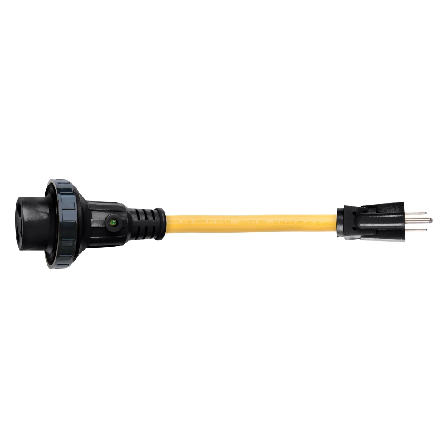 12″ Dogbone Power Adapter with Handle Grip (15A Straight Male x 30A Locking Female) by ParkPower®. Connect between an inlet and a power cord to resolve power incompatibility issues. Extra wide grip handles, LED indicator lights and outdoor use hard-service cable for quality, durability and UV resistance. The included locking ring creates a watertight seal between the adapter and the inlet.