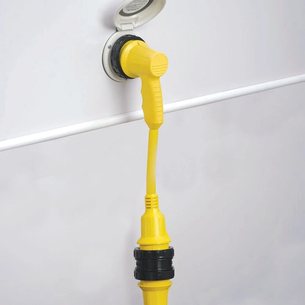 Convert your existing 30A or 50A detachable power cord from a straight connection to a right angle connection. Right angle detachable connections provide minimal cordset protrusion from inlets for more clearance in tight RV spaces and reduces strain at the inlet connection. The GripLock handle design allows easy hook-up and correct blade alignment with the inlet, even in darkness.