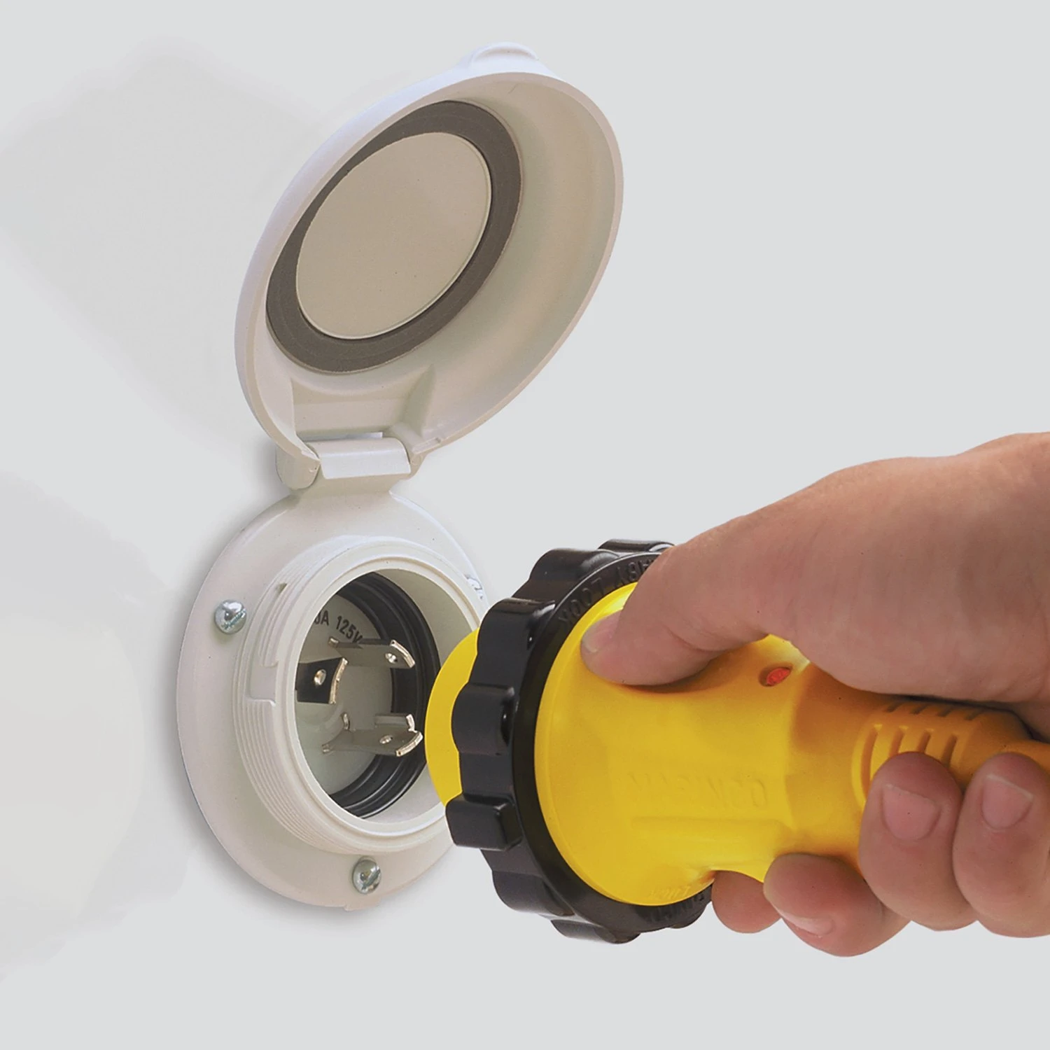 25′ Extension Power Cord with Handle Grip (30A Locking Male x 30A Straight Female) by ParkPower®. This locking power cord plus cordset ensures your campsite connections are completed. The cordset allows you to securely connect the campground or park power to your vehicle.