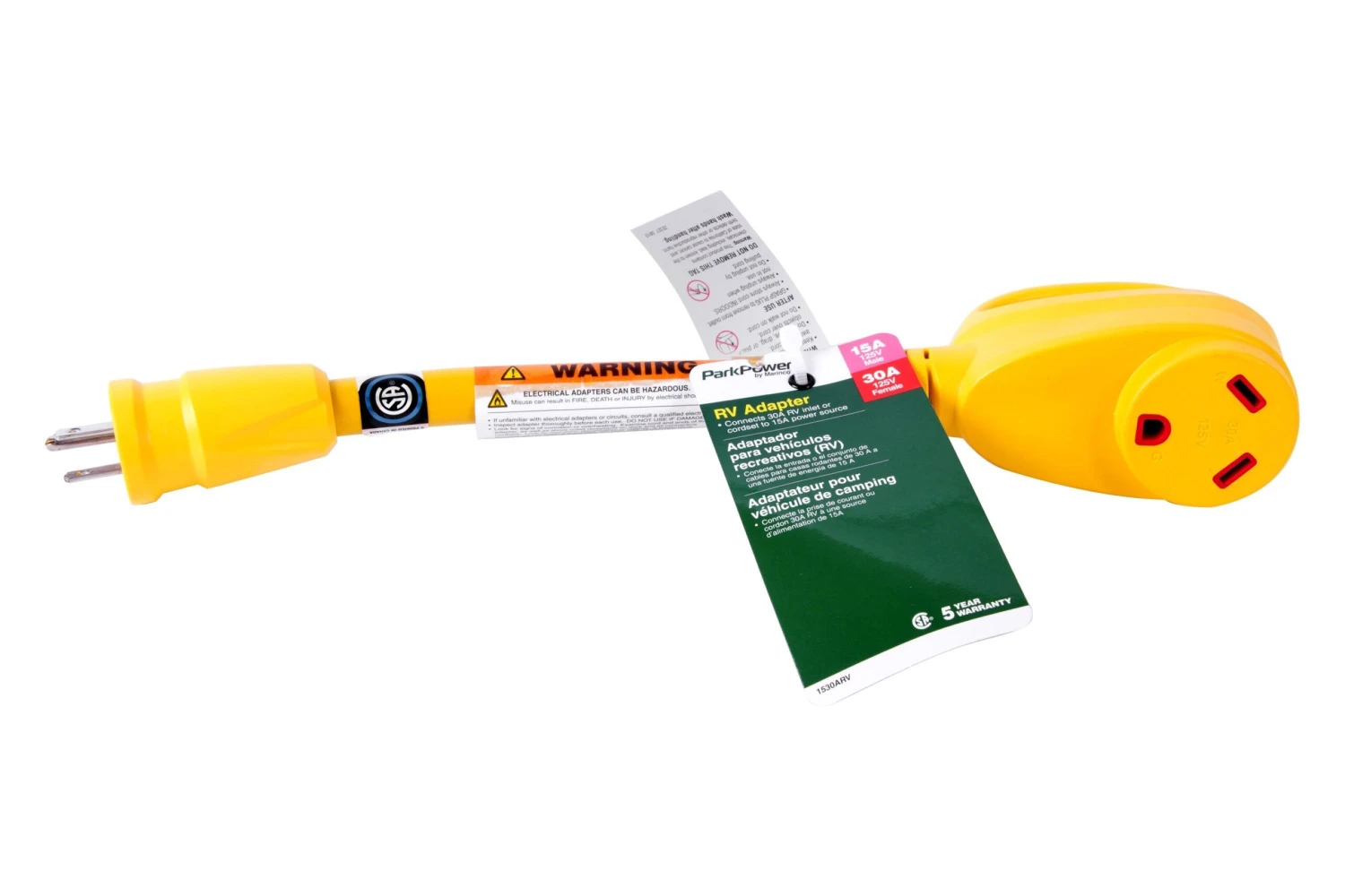 Dogbone Power Adapter with Handle Grip (15A Male x 30A Female) by ParkPower®. Extra wide grip handle and 10/3 outdoor use hard-service cable. This 15 Amp male – 30 Amp female, straight blade adapter allows RV cordsets to connect with standard outlets that have dissimilar power configurations. For easier gripping, the adapter features an extra wide handle for plugging and unplugging.