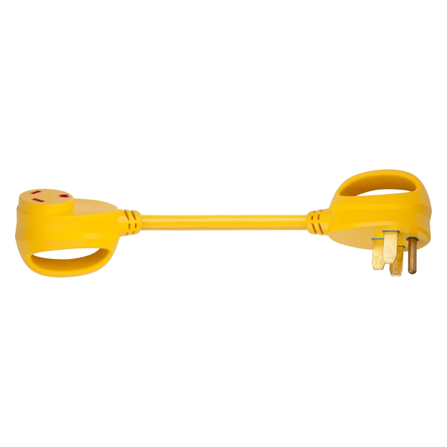 Dogbone Power Adapter with Handle Grip (50A Straight Male x 30A Locking Female) by ParkPower®. Extra wide grip handle and 10/3 outdoor use hard-service cable. This 50 Amp male – 30 Amp female, straight blade adapter allows for a RV cordset to mate with a standard household outlet that are dissimilar in power configurations. The adapter features extra wide handles, for maximum grip and easier use.