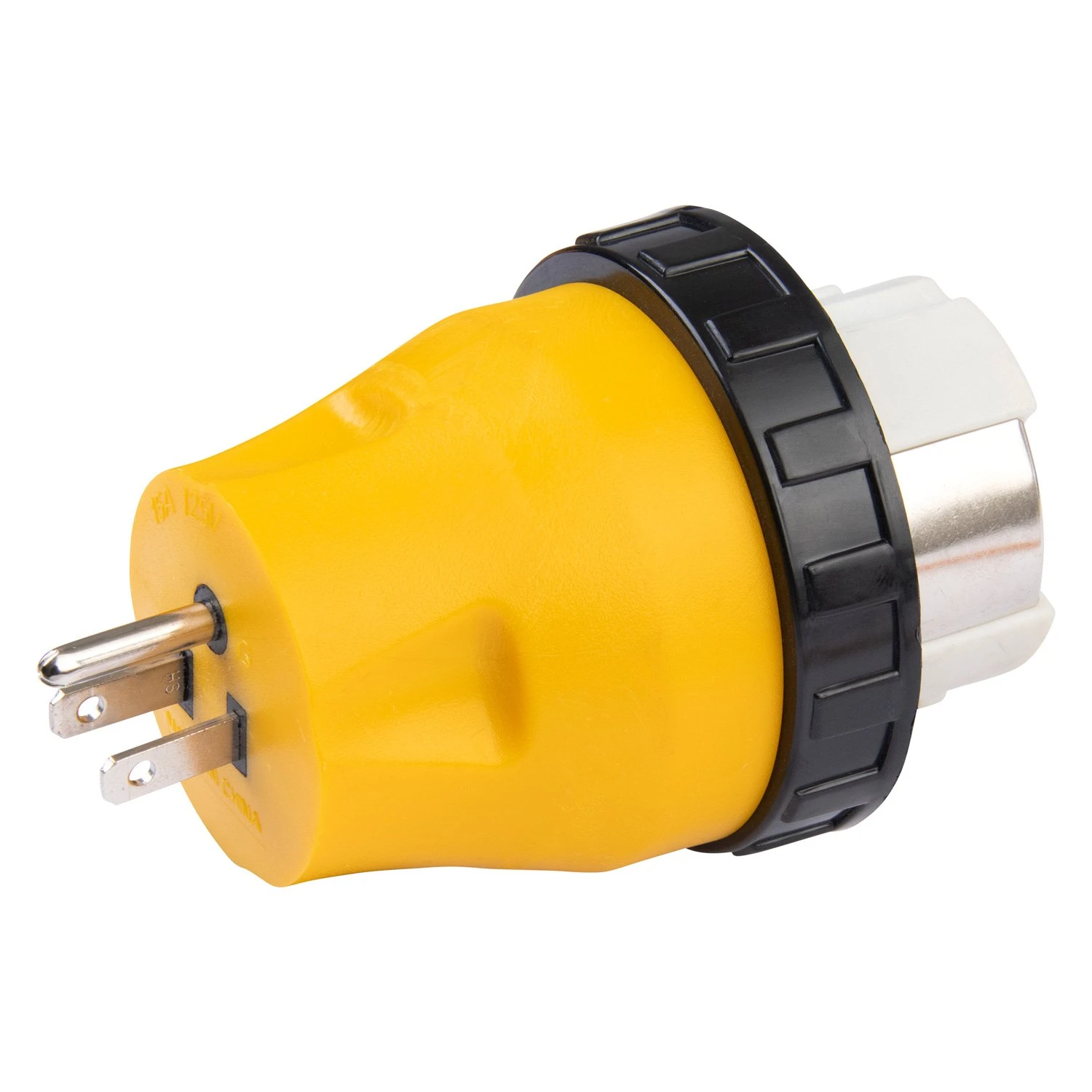 Power Cord Adapter (15A Locking Male x 50A Locking Female) by ParkPower®. Connect between an inlet and a power cord to resolve power incompatibility issues. They feature durable PVC housings and a locking ring for weatherproof connection to RV inlet.