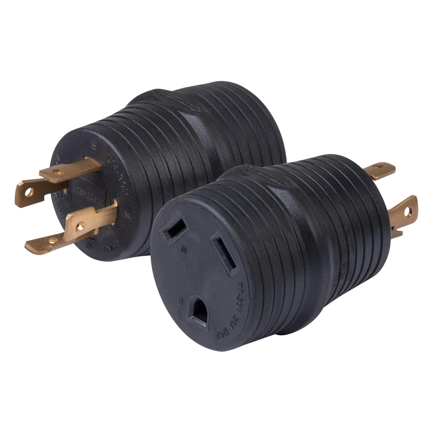 Power Cord Adapter (30A Locking Male x 30A Straight Female) by ParkPower®. Connect between a power cord and a generator power source to resolve power incompatibility issues. They feature heavy-duty weather resistant construction in a compact, unbreakable PVC housing.