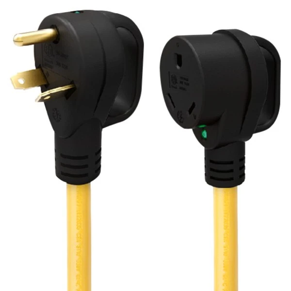Weekender™ 50′ Extension Power Cord with Handle Grip (30A Straight Male x 30A Locking Female) by ParkPower®. 30A Connect between an inlet and a power source to provide power to the RV. Extra wide grip handles, LED indicator lights and outdoor use hard-service cable for quality, durability, and UV resistance. The included locking ring creates a watertight seal between the power cord and the inlet.