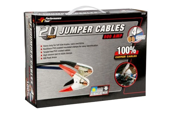 20′ 4 AWG Parrot Jumper Cables by Performance Tool®. Imagine a situation when your battery is dead and you are stuck somewhere on the road. A high-performance engine starter is an essential tool to have at hand in emergency situations, while an efficient battery charger will help you fix the problem of a flat battery in a few hours when there is no rush. Get these premium tools and feel confident to start your vehicle, whatever the situation is.