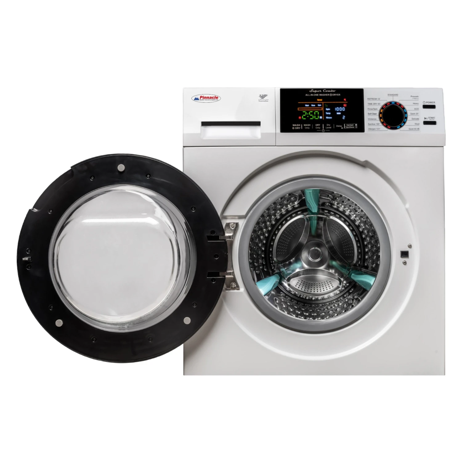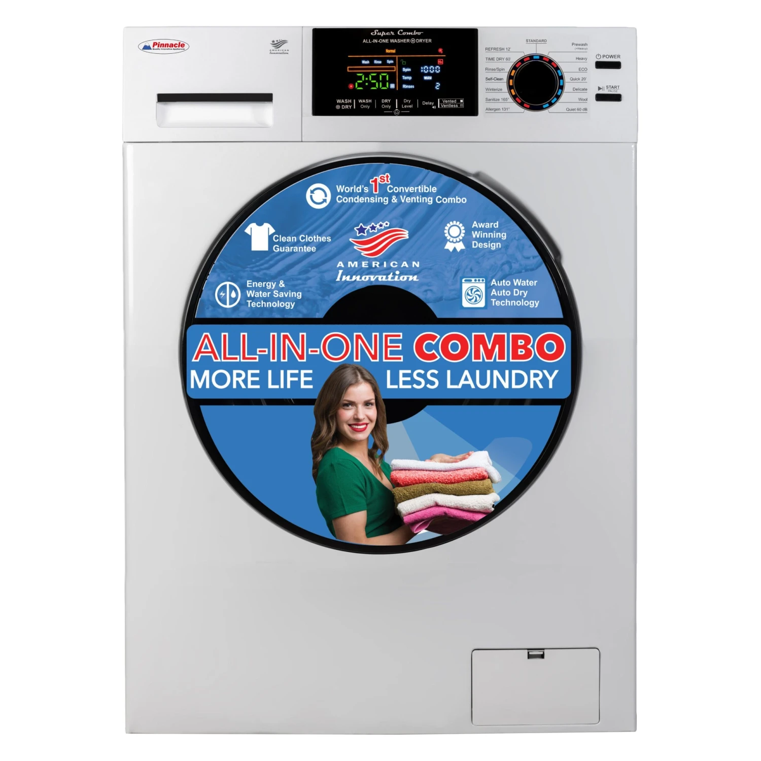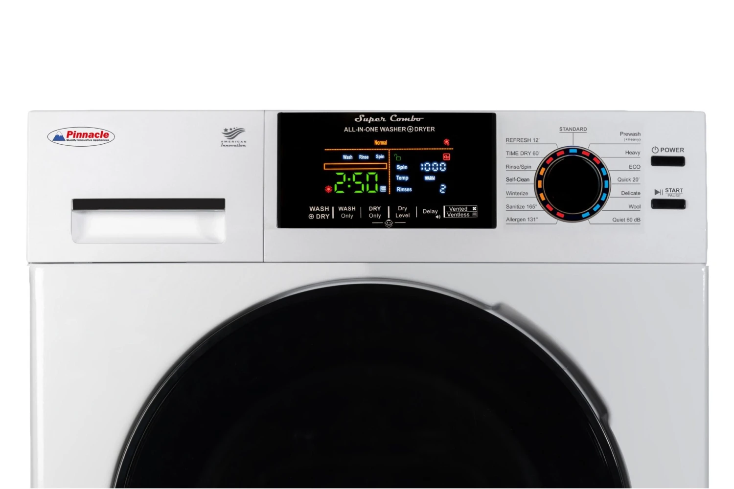 Super Combo™ Compact Front Load RV Washer and Dryer (21-5500 W) by Pinnacle Appliances®. More Life. Safe Life. The Super Combo 21-5500 XL is the latest edition in Pinnacle’s lineup and features new Sanitize, Allergen, Quiet and Winterize programs. The 5500 features a color-coded, intuitive control panel with a fully automated simple 2-Step operation. With a capacity of 18 lbs the Super Combo can wash and dry completely automatically in a single unit. It uses sensors to measure the correct water for a wash load and will heat dry for the optimum time without any waste of energy. It is the only combo in the world which offers an optional vented or condensing dry that can be changed according to the season at the touch of a button (patent pending). Discover the convenience of completely automatic laundry in your RV.