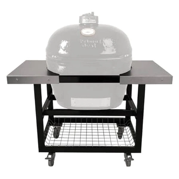 Cart with Basket and Stainless Steel Side Shelves (PG00370) by Primo Grills®. For Oval LG 300 and XL 400 Grills. The cart has two locking casters in the front to keep your grill in place while cooking. Primo sturdy metal Cart Base is intended for use with stainless steel and poly tops. It offers a lower basket and offers durability, protection and mobility.