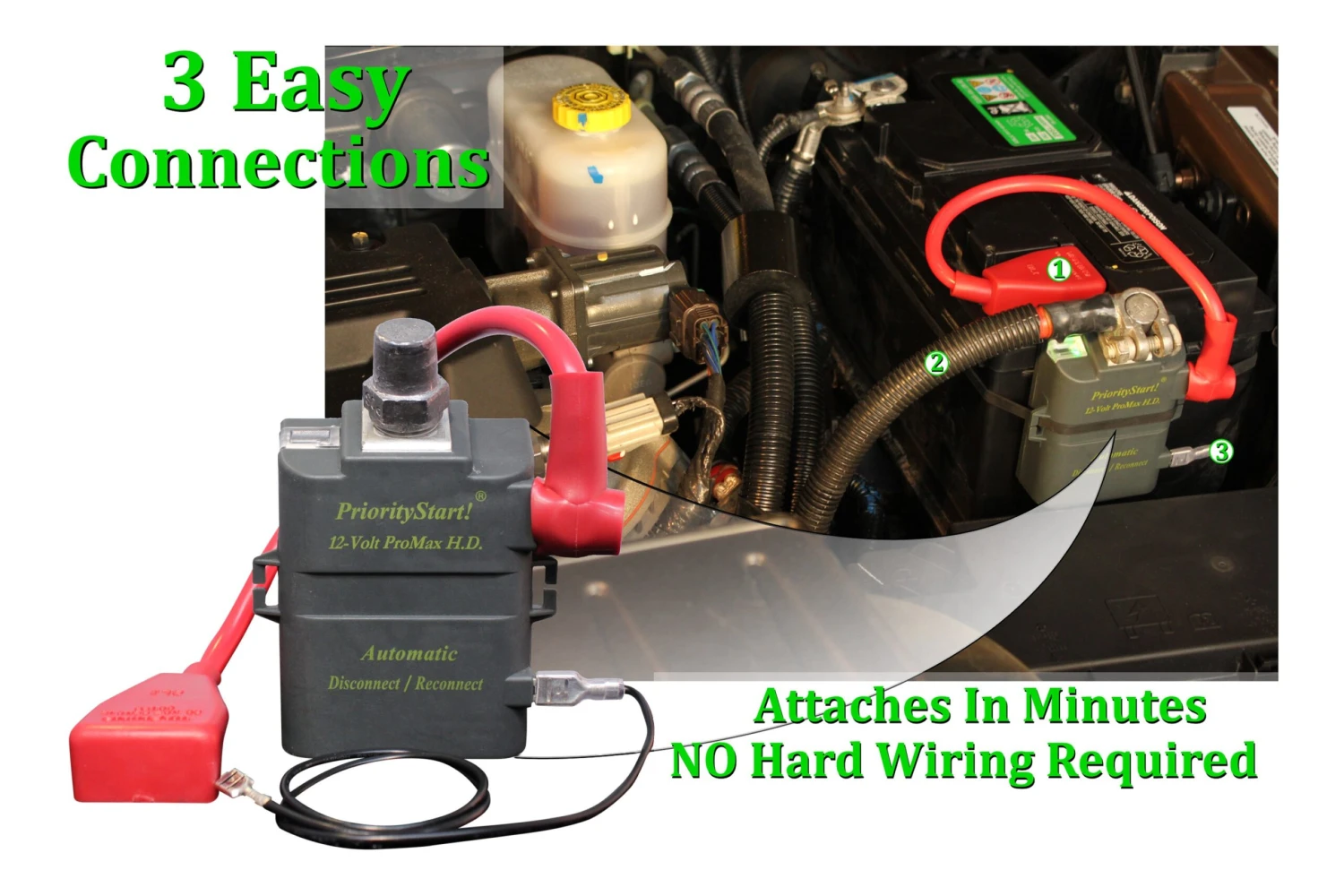ProMax™ 12 V Heavy Duty Automatic Battery Power Protection by PriorityStart®. The 12V ProMax H.D. from PriorityStart! is the only automatic computerized on/off protection system for your battery, alternator, and electrical system on the market today. It recognizes when your battery’s voltage drops to 11.7 volts, and then disconnects so that the battery’s voltage can recover. The 12V ProMax H.D. offers heavier load capacity (up to 1,600 starting A/400 continuous A) for the effectiveness you want.