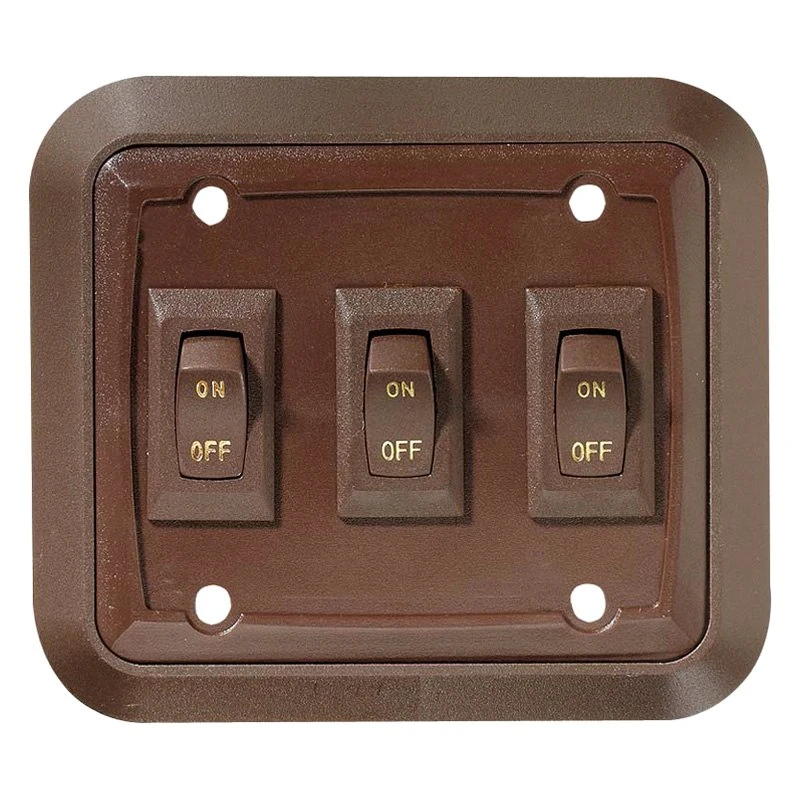 Triple SPST On/Off Labled Brown Lighting Switch by RV Designer®. Designed with high precision and functionality in mind to provide flawless, reliable service and make camping a safe and more comfortable experience. The product is intended especially for RV applications. It’s manufactured from superior-grade materials using innovative equipment to provide dependable quality and superior value. It’s expected to serve you for the long haul.