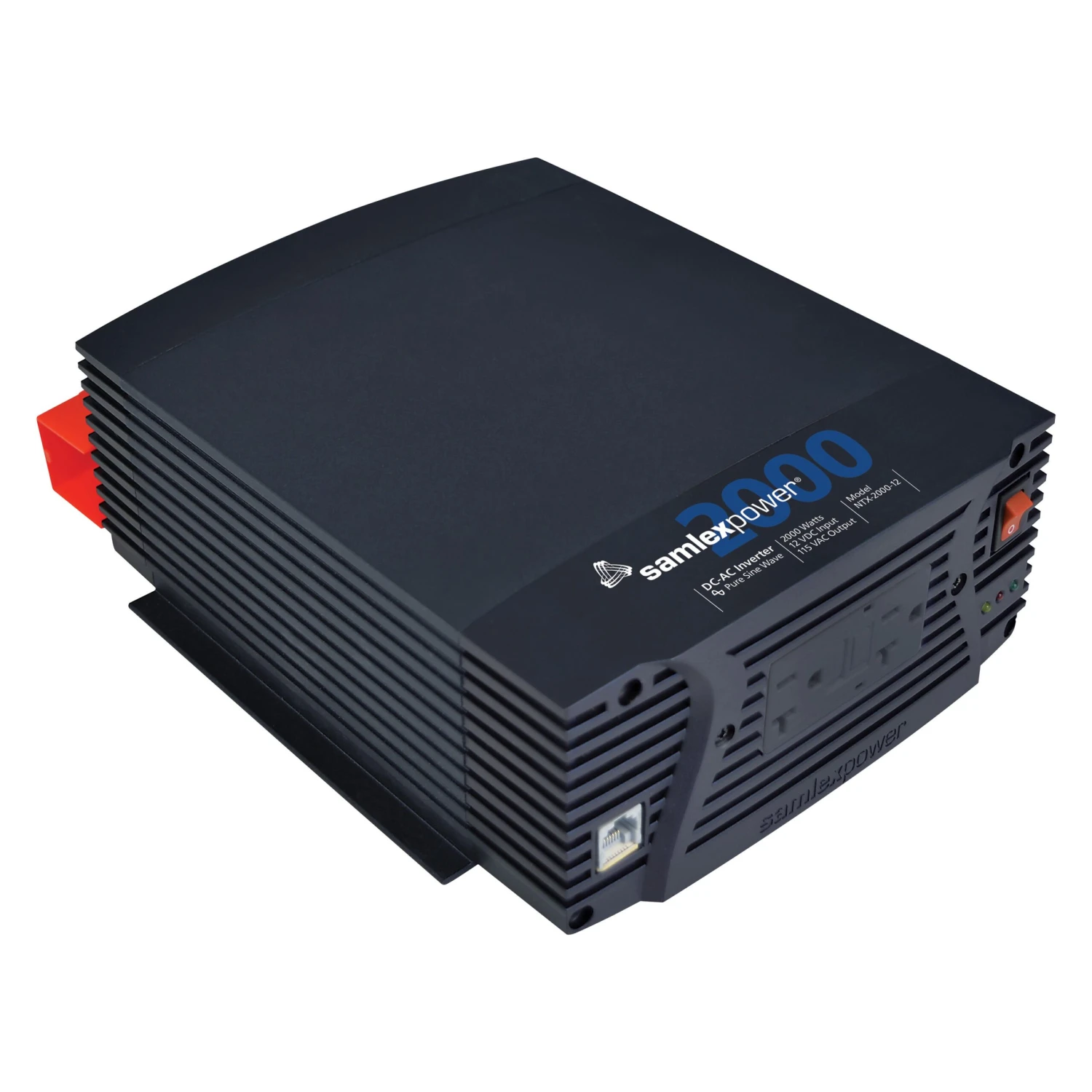 2000W 12 DC 115 AC Pure Sine Wave Power Inverter by Samlex®. This power inverter is FCC certified to ensure electrical interference will not be a problem when operating near sensitive equipment. Compact and lightweight, the NTX inverters have a single variable speed temperature and load-controlled fan for quiet operation.