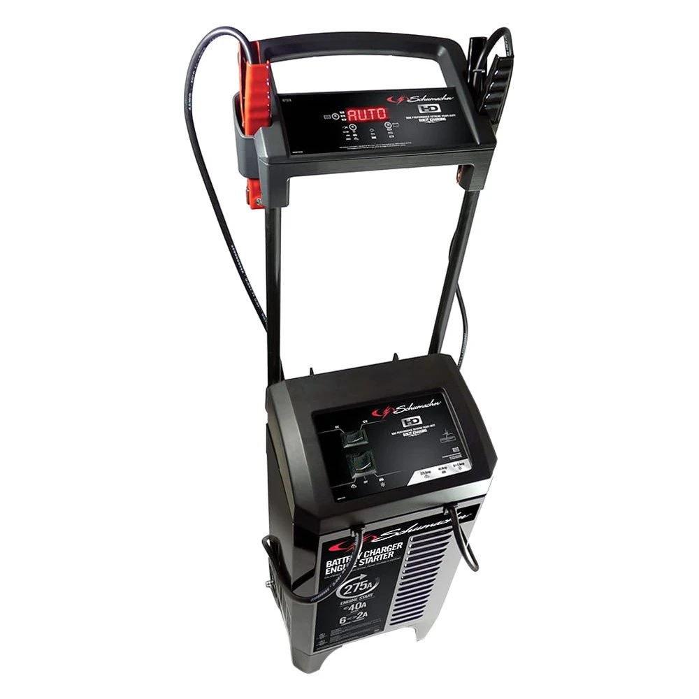 6 V/12 V Wheeled Battery Charger and Engine Starter (SC1326) by Schumacher®. Charges standard, AGM, Gel and deep-cycle batteries 270A Engine Start – powerful enough for SUVs, trucks and large engines 40A Boost mode – quickly brings deeply discharged batteries back to life Multi-function battery tester – for battery status and charging system analysis Microprocessor-controlled – automatically adjusts amperage rate, to charge and maintain Multi-stage charging – for added precision, safety and battery life Float mode monitoring – maintains optimum battery charge Auto voltage detection Reverse hook-up protection Scrolling digital display ? gives step-by-step instructions to properly charge your battery LED indicators and push-button controls 4-gauge output cables ? stay flexible in cold weather Clamps and cords on front of unit Convenient clamp rest in handle Compact wheels for easy storage Schu Eco Energy ? meets the highest industry standards DOE compliant