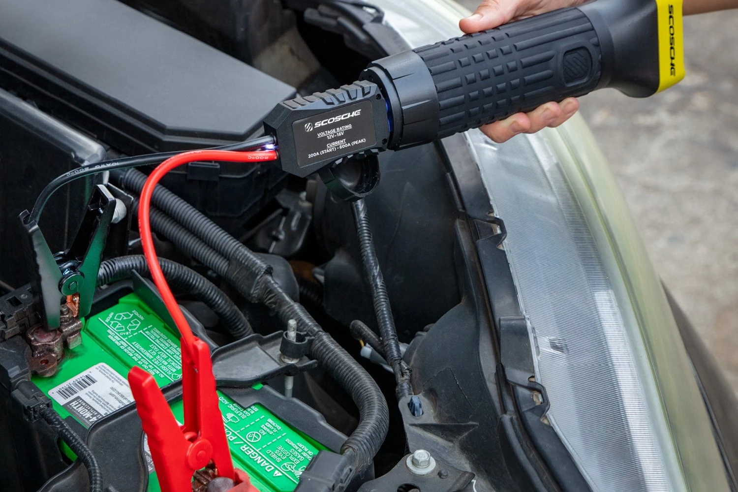 12 V Portable Jump Starter and Power Bank with Flashlight by Scosche®. The Scosche PBJF600 is the compact and lightweight portable answer to vehicle emergency situations. It’s advanced technology and ample power will jump start your car, truck, boat, SUV or motorcycle when the vehicles battery is low or completely dead with the 600A peak portable battery. The LED flashlight has 300 lumens with 4 different level modes of brightness plus SOS mode for use in situations with very low light or while you are out at night or in case of an emergency. Use it to jump batteries with an 8-cylinder/5.0 liter engine or a diesel vehicle with up to 2.0-liters.