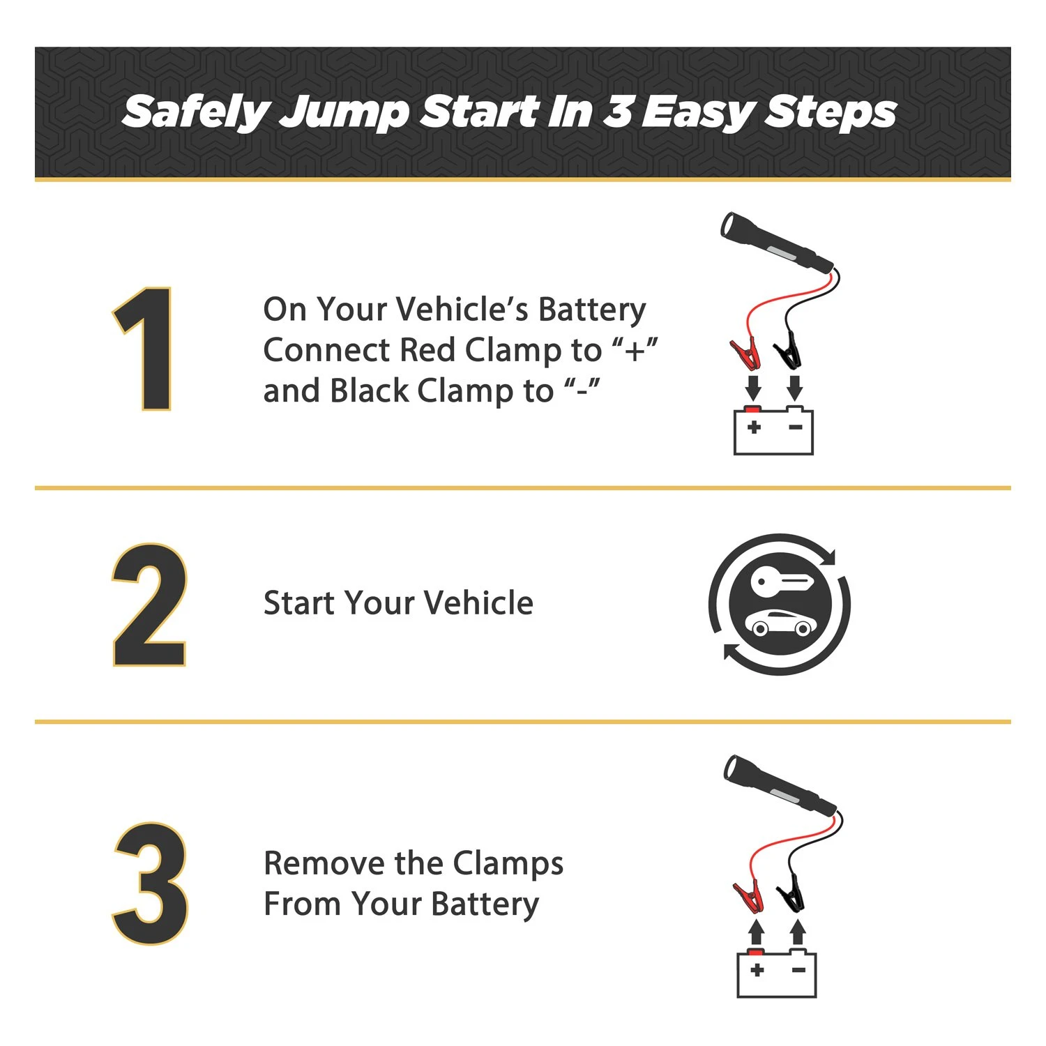 - Jumpstarts Vehicles with Engines Up to 8 Cylinder/5.0-Liters (Or 2.0-Liter Diesel Engines)