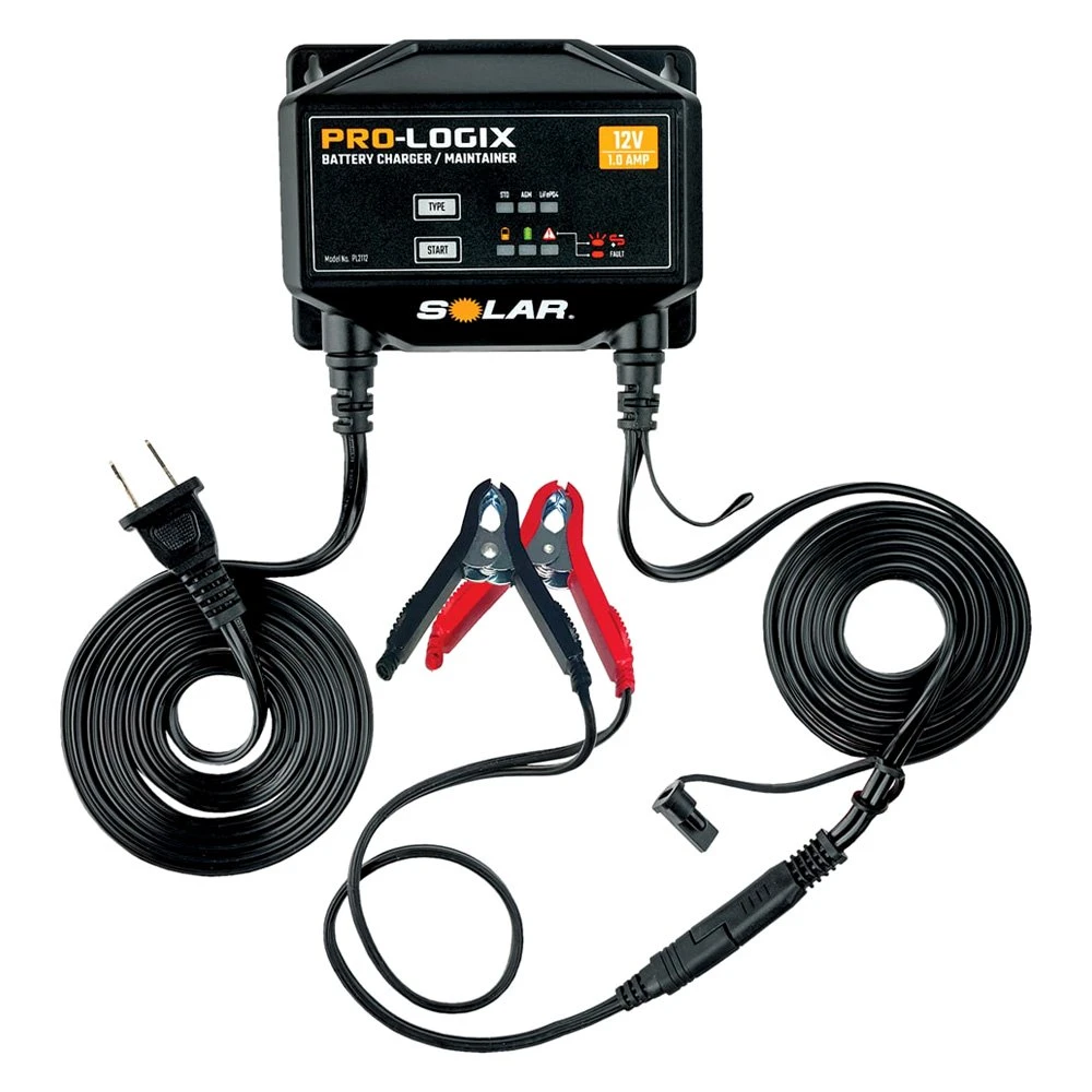 12 V Portable 7-Step Intelligent Automatic Battery Charger and Maintainer by Solar®. PL2112 Solar Pro-Logix 12V 1 Amp Lithium Battery Charger / Maintainer. PRO-LOGIX battery chargers from SOLAR are designed to provide continuous operation in a wide variety of professional and industrial battery service environments. They combine fully automatic operation utilizing a proprietary multi-phase charging process with the ability to properly charge multiple battery types. Advanced charging logic, robust components, quick set-up and smart display feedback mean effective and efficient charging for your operation. Model PL2112 is perfect for keeping batteries fully charged in long term charging applications, such as seasonal use vehicles. It is compatible with a wide variety of battery types, including Conventional, AGM, Spiral Wound, Deep Cycle, Marine and Lithium (LiFePO4) batteries. Almost any 12 V starting battery installed in a vehicle, boat or implement can be charged and maintained properly, ensuring that it is ready when you need it next.