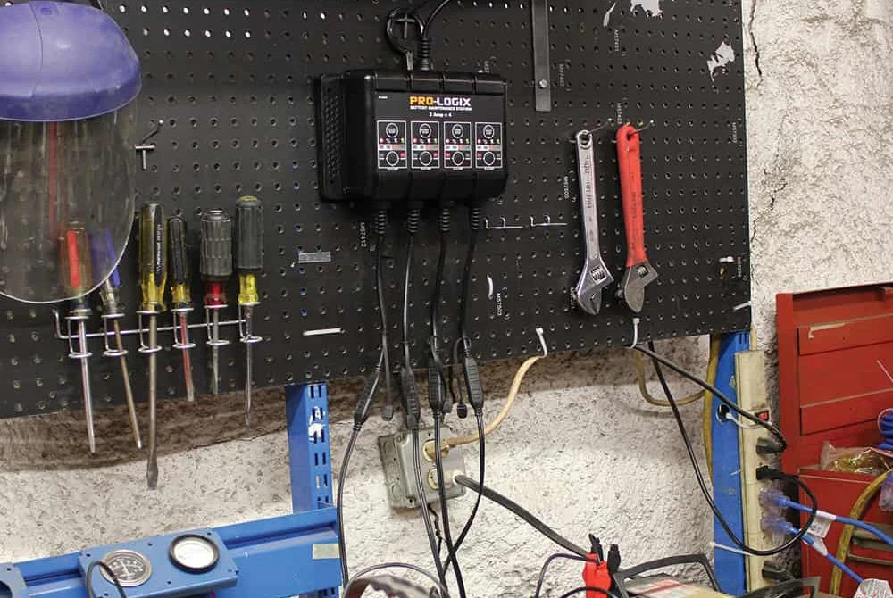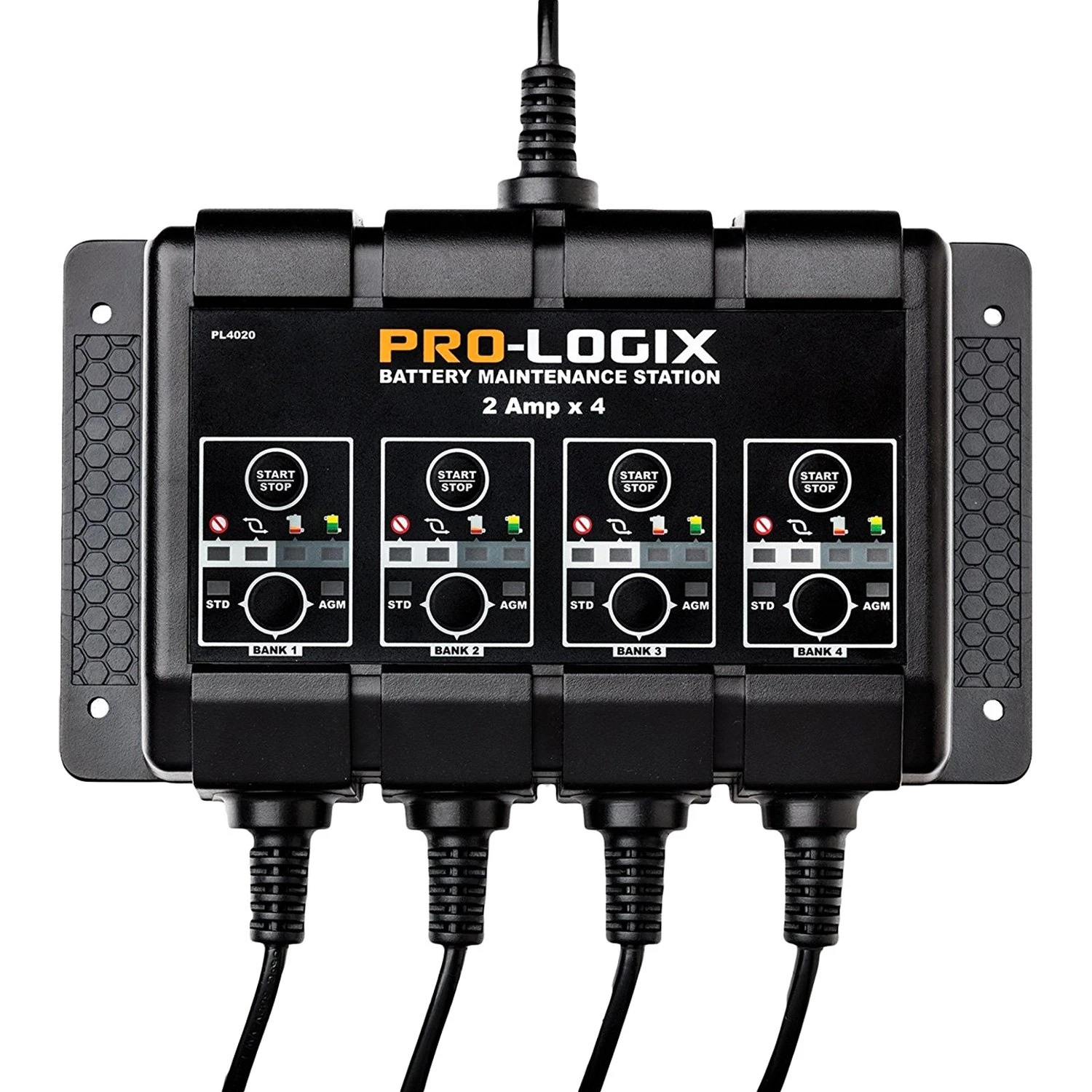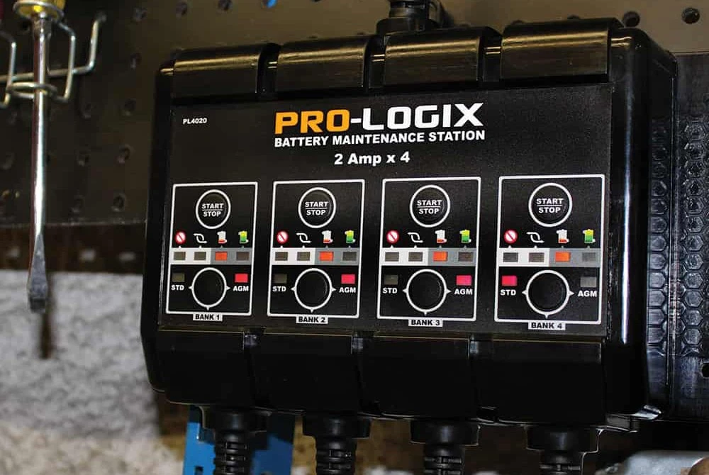 Pro-Logix™ 12 V Compact Battery Charger Station and Maintainer by Solar®. Model PL4020 is a perfect charger to meet the needs of mechanical repair shops, collision repair facilities, fleet operations, marinas and consumers. It features four independent output channels designed to properly charge a flooded or AGM (including Sprial Wound) battery. Because each output is independent of the others, a troublesome battery on one channel does not create problems for the other channels. It combines fully automatic operation with the ability to properly charge multiple battery types. Advanced charging logic, robust components, quick set-up and smart display feedback mean effective and efficient charging for your operation.