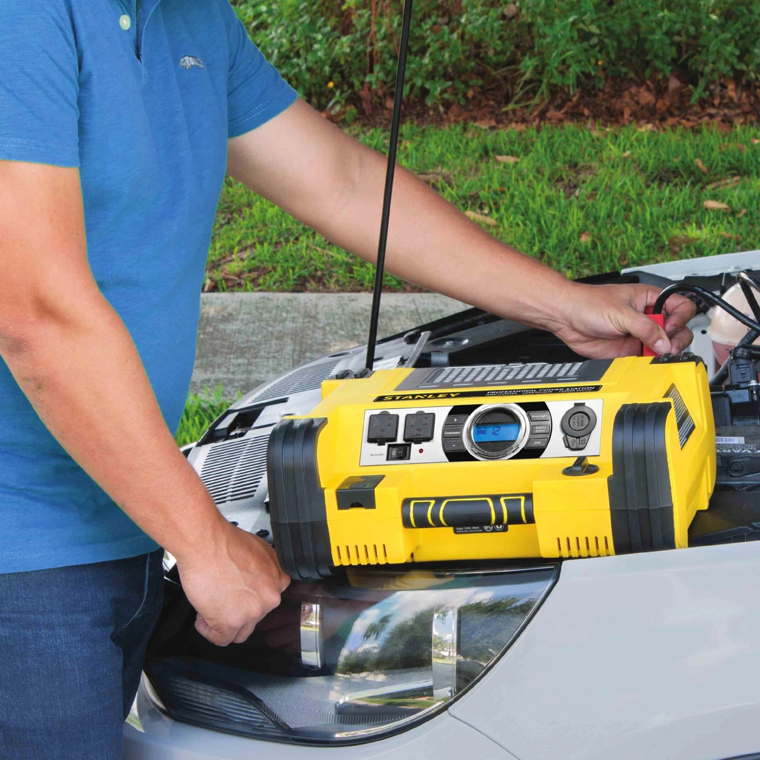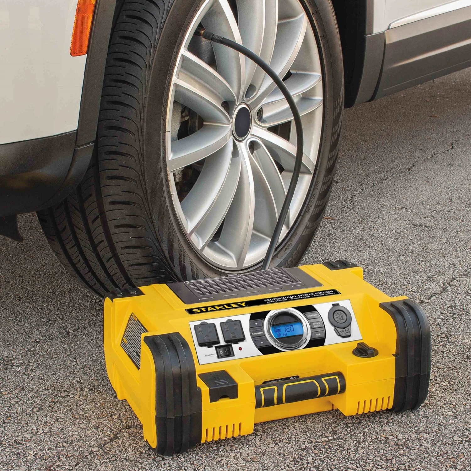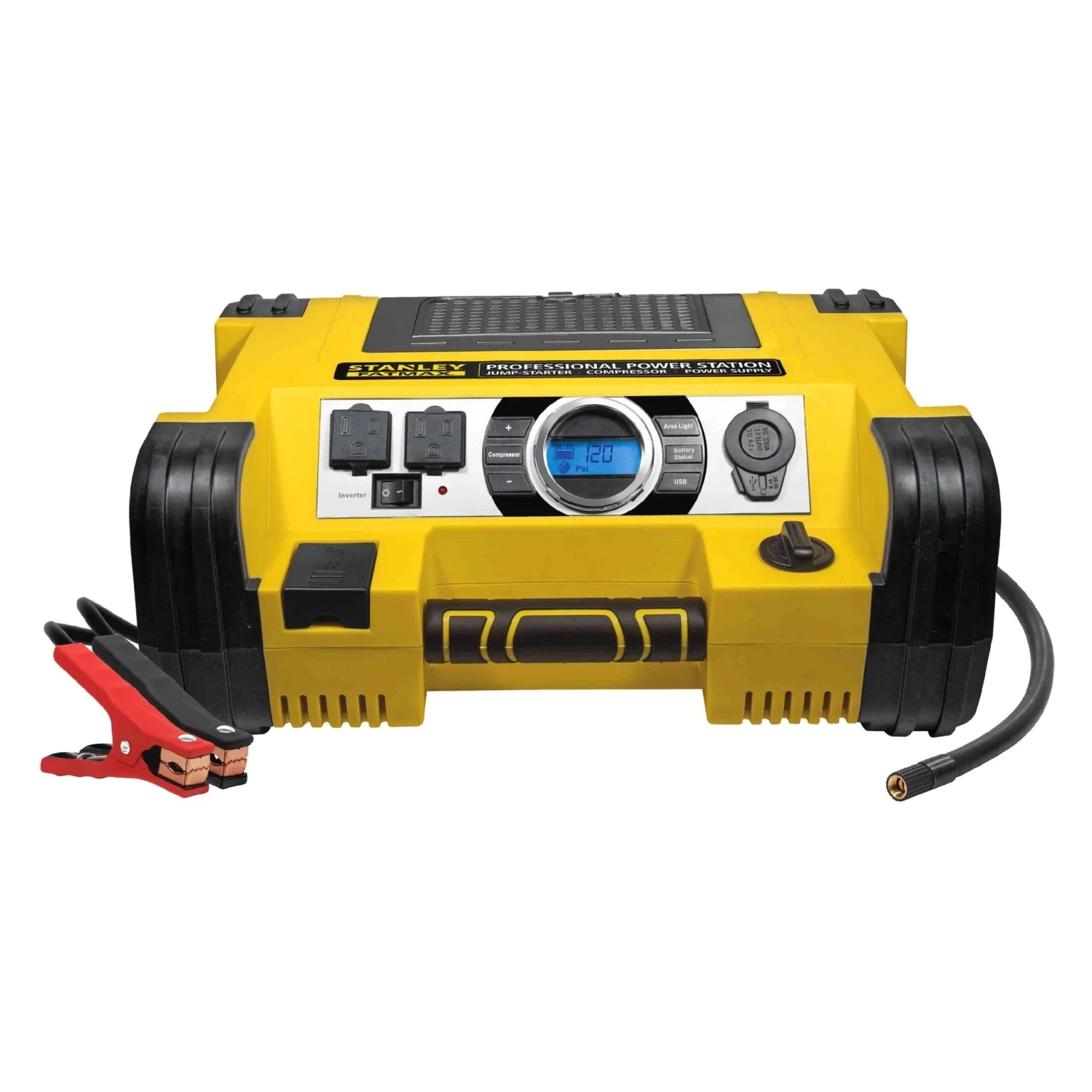 Professional™ 12 V Portable Battery Power Station and Digital GA with 500 W Inverter by Stanley Tools®. Don’t get stranded without the power you need. The Stanley FatMax Power Station is a portable jump starter, digital air compressor, and power supply in one. The Professional Power Station combines a 700 Instant amp jump starter, 500 Watts of AC power, and 120 PSI digital air-compressor.