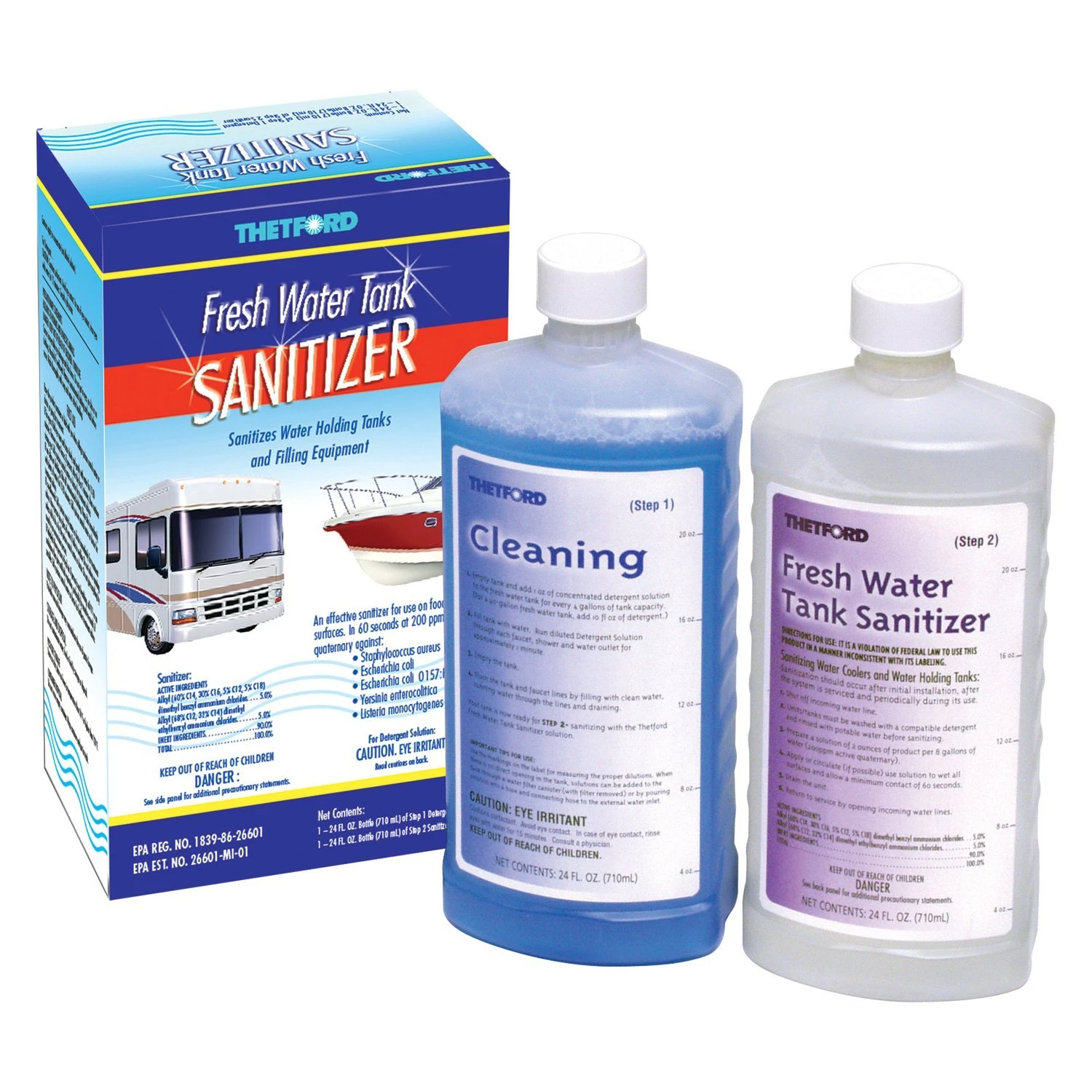 24 oz. Fresh Water Tank Treatment with Sanitizes (2 Pieces) by Thetford®. Fresh Water Tank Sanitizer kills more than 99 Percent of bacteria in 60 seconds. It is a non-additive, meant to clean and sanitize the walls of the tank and plumbing, not the water. Some RVers use chlorine or bleach based additives to control bacteria, adding them directly to their fresh water and drinking it.