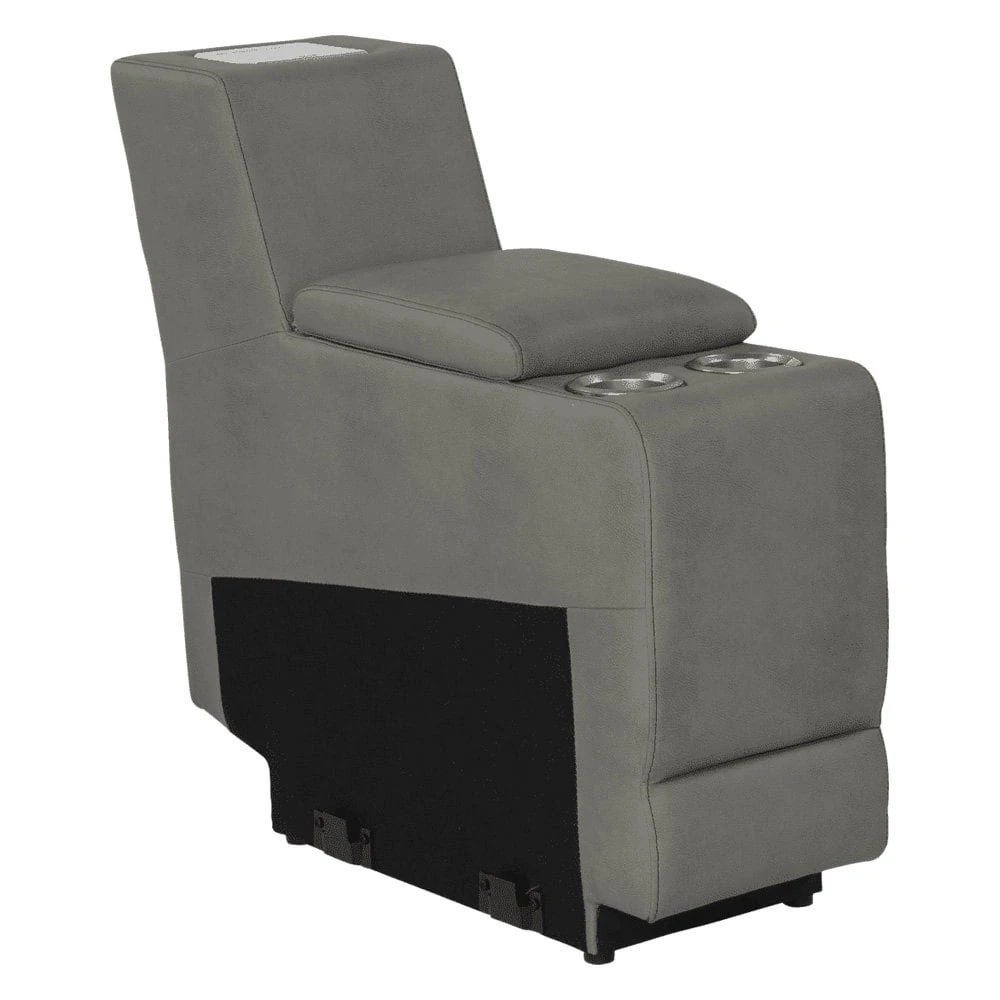 Seismic Series Grummond RV Theater Seating Center Console by Thomas Payne®. Seismic Series Theater Seating turns your RV living space into a high-tech, extra-cozy relaxation sanctuary. Featuring the all-new Thomas Payne Power Port, the best part about this theater-style sofa is that you can conveniently add new line of Thomas Payne accessories to your living space. From wine holders and desks to a wireless phone charger, reading light, armrest tray, and fan – all you have to do is plug your accessory into the Power Port and enjoy. Comes with fully equipped power recline?and lumbar functionalities, heated seats and massage options,?a chaise-style footrest, LED lighting, lighted?dual?cupholders, an integrated storage compartment, and fold-down center console.