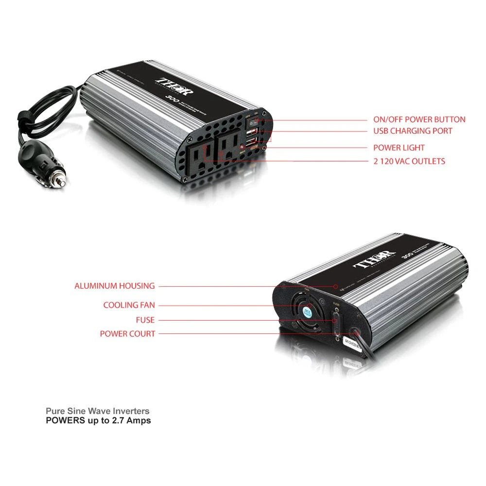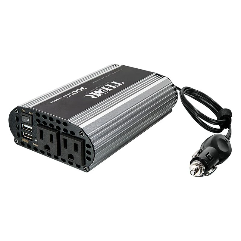 PW Series 300W 12 DC 120 AC Pure Sine Wave Power Inverter by Thor®. THOR Pure Sine Wave inverters have set the standard with the way you deal with your mobile power needs, providing AC electricity. A power inverter converts the DC electricity from batteries into everyday AC power. With this 300W pure sine inverter (12V) you won’t need to rely on DC-powered electronics or a generator to have power for tools, electronics, or any AC power needs.