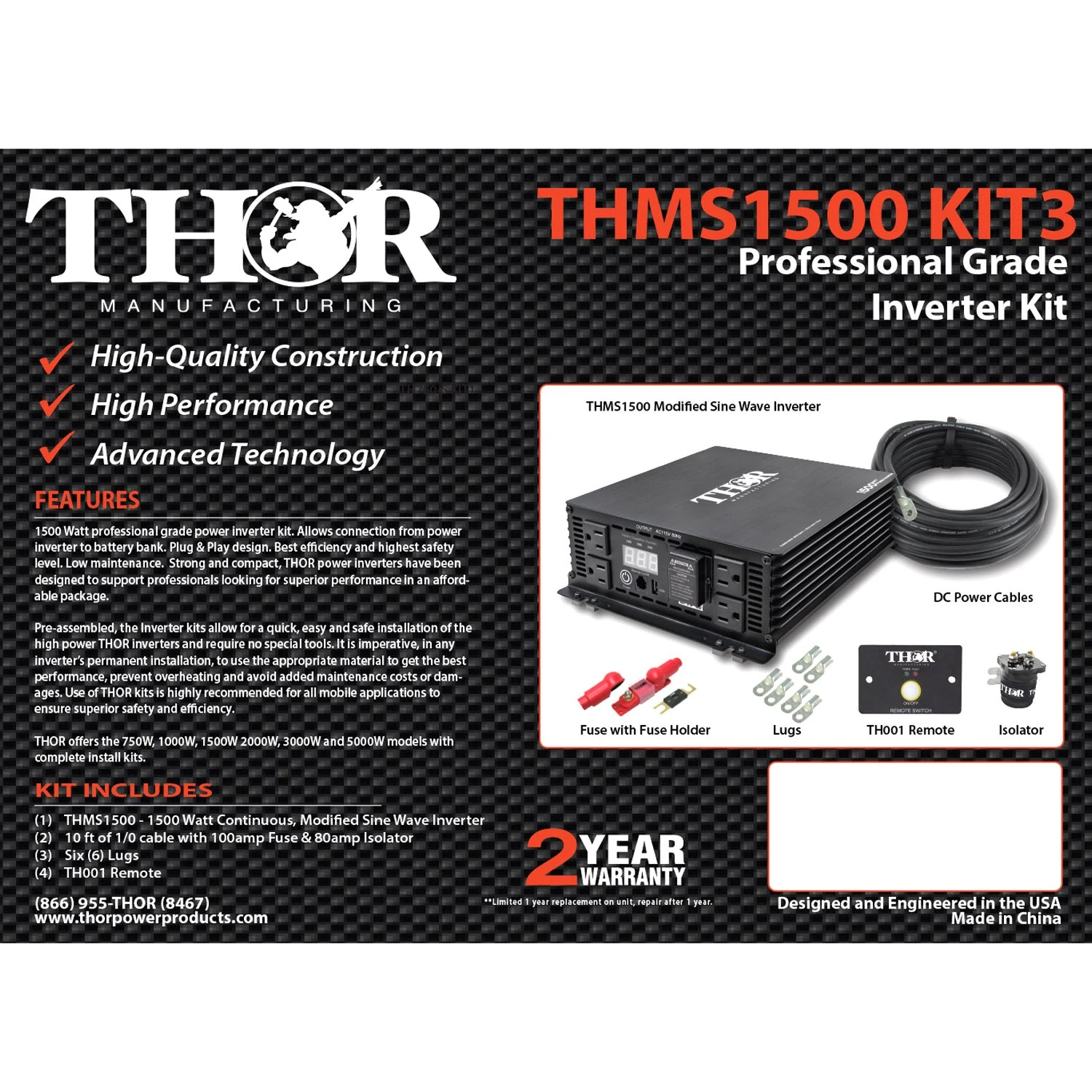 1500W Modified Sine Wave Inverter Kit (THMS1500 KIT3) by Thor®. 1500 Watt professional grade power inverter kit. Allows connection from power inverter to battery bank. Plug & Play design. Best efficiency and highest safety level. Low maintenance. Strong and compact, THOR power inverters have been designed to support professionals looking for superior performance in an affordable package. Pre-assembled, professional power inverter kits allow for a quick, easy and safe installation of the high power THOR inverters and require no special tools. It is imperative, in any inverter’s permanent installation, to use the appropriate material to get the best performance, prevent overheating and avoid added maintenance costs or damages. Use of THOR kits is highly recommended for all mobile applications to ensure superior safety and efficiency.