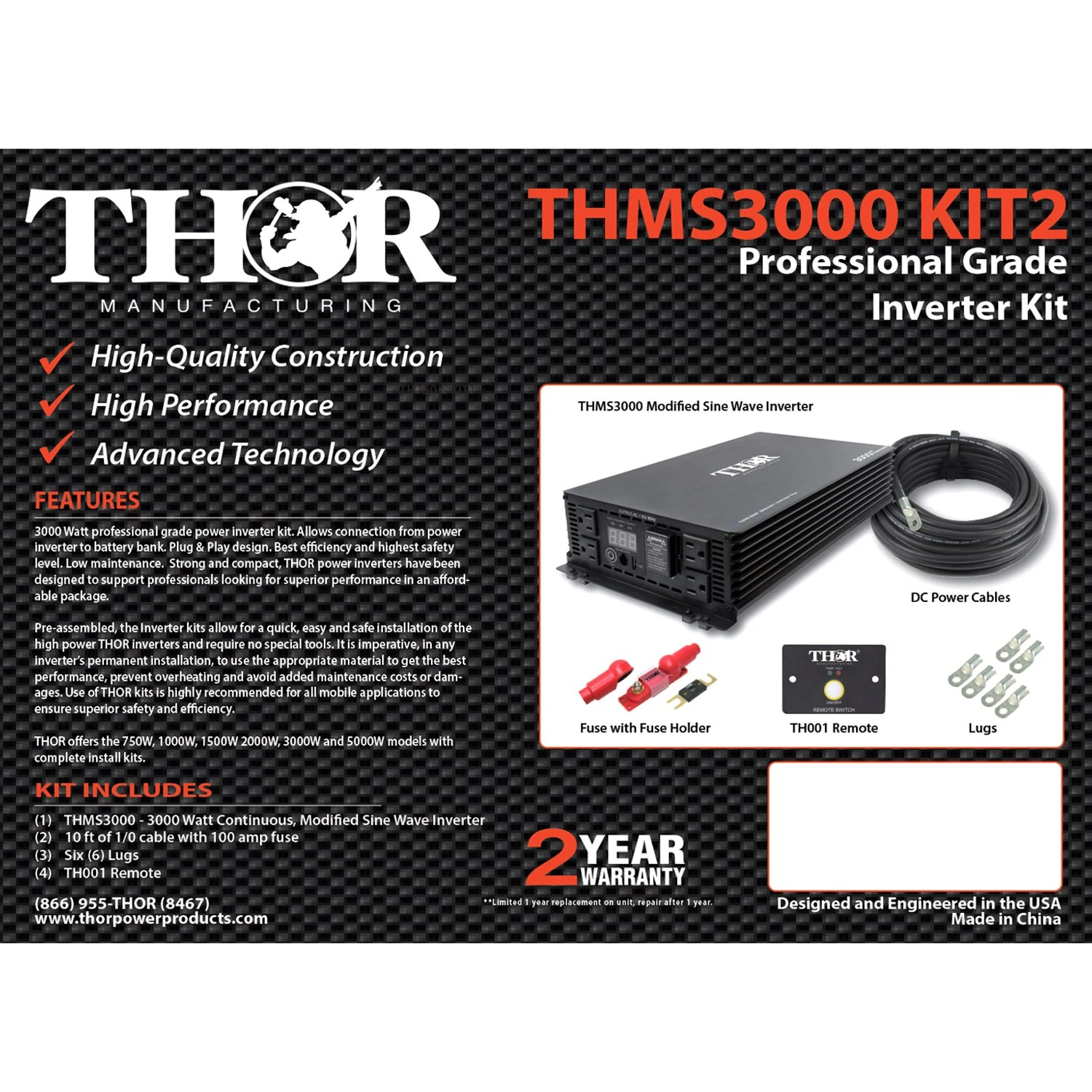 3000W Modified Sine Wave Inverter Kit (THMS3000 KIT2) by Thor®. 3000 Watt professional grade power inverter kit. Allows connection from power inverter to battery bank. Plug & Play design. Best efficiency and highest safety level. Low maintenance. Strong and compact, THOR power inverters have been designed to support professionals looking for superior performance in an affordable package. Pre-assembled, the Inverter kits allow for a quick, easy and safe installation of the high power THOR inverters and require no special tools. It is imperative, in any inverter’s permanent installation, to use the appropriate material to get the best performance, prevent overheating and avoid added maintenance costs or damages. Use of THOR kits is highly recommended for all mobile applications to ensure superior safety and efficiency.
