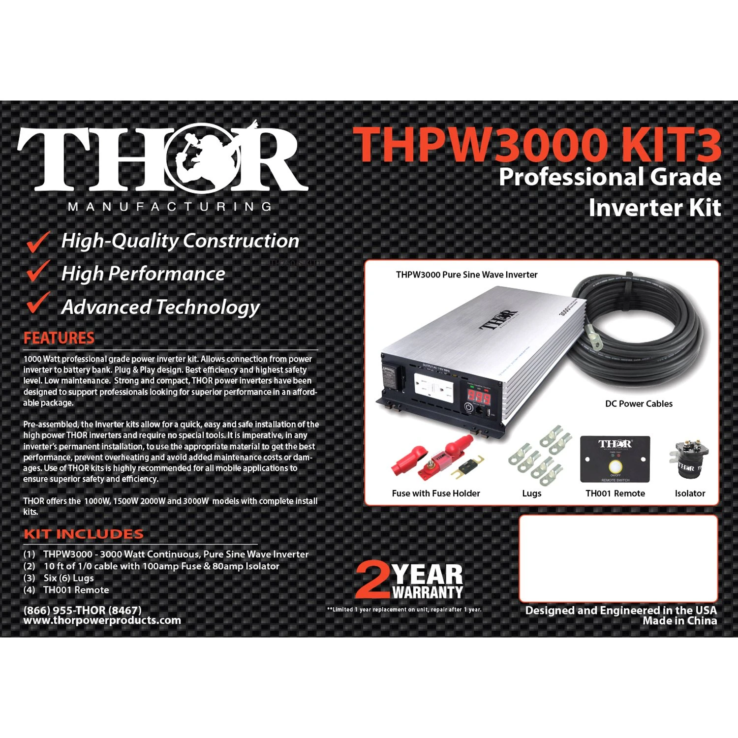 3000W Pure Sine Wave Inverter Kit (THPW3000 KIT3) by Thor®. Professional grade 3000 watt inverter install kit. Allows connection from power inverter to battery bank. Plug & Play design. Best efficiency and highest safety level. Low maintenance. Strong and compact, THOR power inverters have been designed to support professionals looking for superior performance in an affordable package. Pre-assembled, this 3000 watt inverter install kit allows for a quick, easy and safe installation of the high power THOR inverters and require no special tools. It is imperative, in any inverter’s permanent installation, to use the appropriate material to get the best performance, prevent overheating and avoid added maintenance costs or damages. Use of THOR inverter install kits is highly recommended for all mobile applications to ensure superior safety and efficiency.