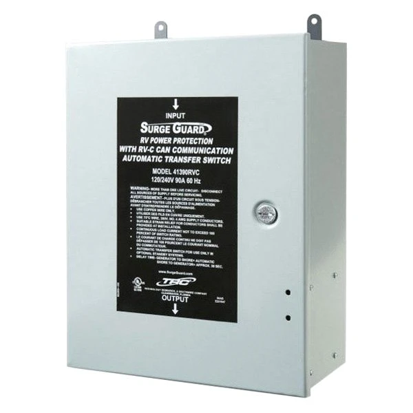 90A Surge Protected Hardwire Transfer Switch with Full RV Power Protection by TRC®. Surge Guard Model 41390-RVC provides premium protection for your motorhome and enhanced features over other transfer switches on the market. Total electrical protection for your RV. Protects your RV bumper to bumper from faulty park power. Optional, easy to read LCD display constantly monitors and displays the condition of power being supplied to your RV. RVC communication allows instant display of voltage, current and fault conditions on an RVC compatible device. Transfers to generator power automatically when energized after 30 2nd delay. When both shore power and generator power are available, generator dominates after a 30 2nd delay. Once the generator is shut down, shore power activates after a 3-4 2nd delay. With Full RV Power Protection.