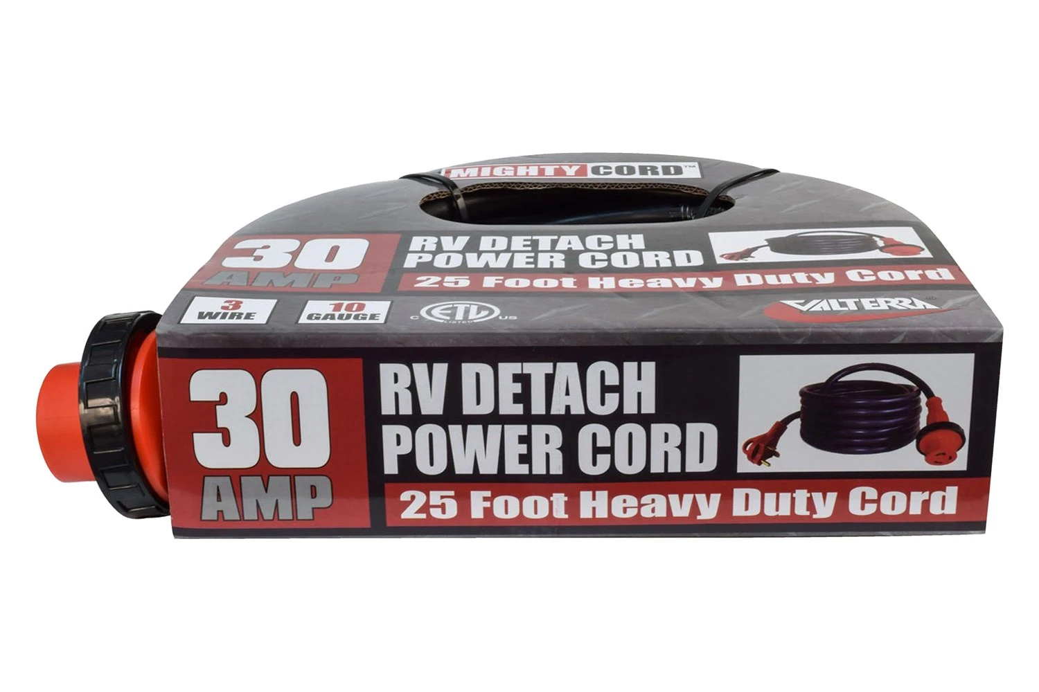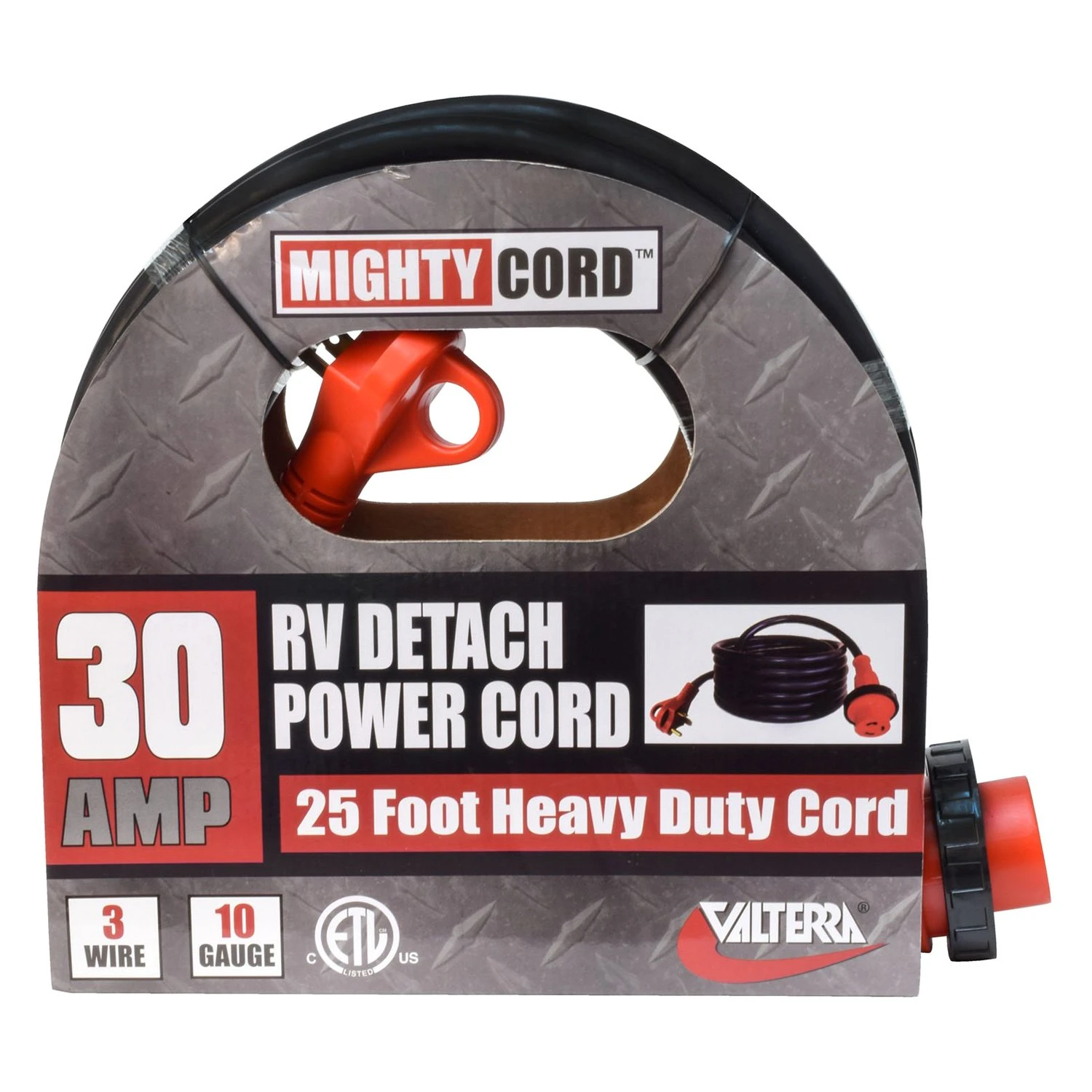 Mighty Cord™ 25′ Extension Power Cord with Handle Grip (30A Straight Male x 30A Locking Female) (A10-3025ED) by Valterra®. Heavy duty 30Amp RV power cord features a detachable female receptacle with locking ring and finger grip handle on the male end. Extends power up to 25′ from the original source.