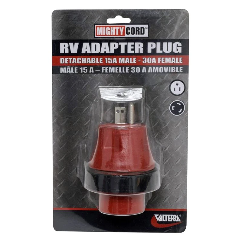 Mighty Cord™ Power Cord Adapter (15A Straight Male x 30A Locking Female) by Valterra®. Detachable female receptacle with ring and finger grip male plug makes hooking up the RV to campground power easy and convenient. This product is meant to keep you charged with power and make your campering a safer and more comfortable experience. Developed with accuracy and modern technologies, it delivers high functionality. This product will help you enjoy almost like-home convenience. It ensures to deliver optimum performance, high reliability, and dependable, lasting service.