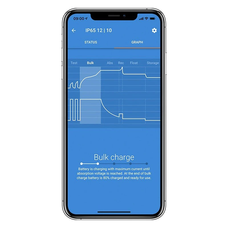 The Blue Smart IP65 is equipped with built-in Bluetooth, so the status of the charger and the battery can be checked on a smartphone, tablet or laptop. All settings of the charger can be configured with the VictronConnect app.