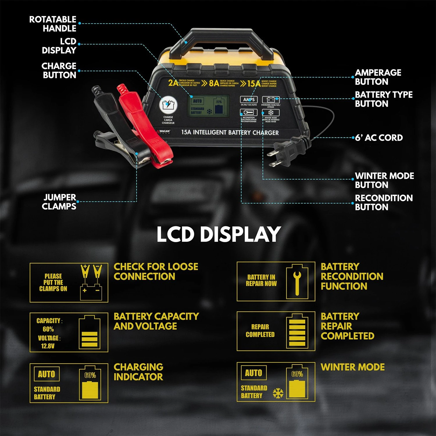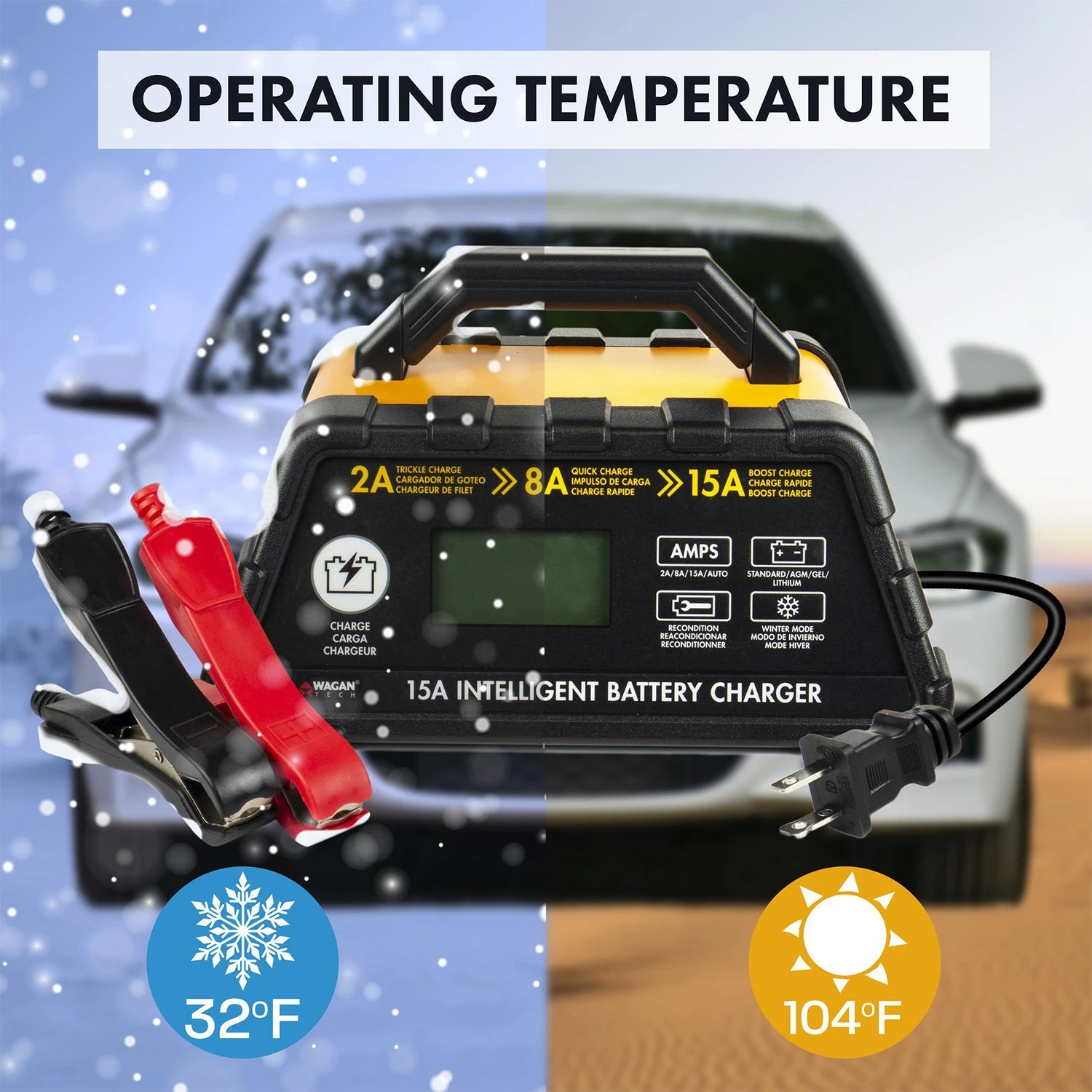 12 V Intelligent Fully Automatic Battery Charger and Maintainer by Wagan®. Imagine a situation when your battery is dead and you are stuck somewhere on the road. A high-performance engine starter is an essential tool to have at hand in emergency situations, while an efficient battery charger will help you fix the problem of a flat battery in a few hours when there is no rush. Get these premium tools and feel confident to start your vehicle, whatever the situation is.