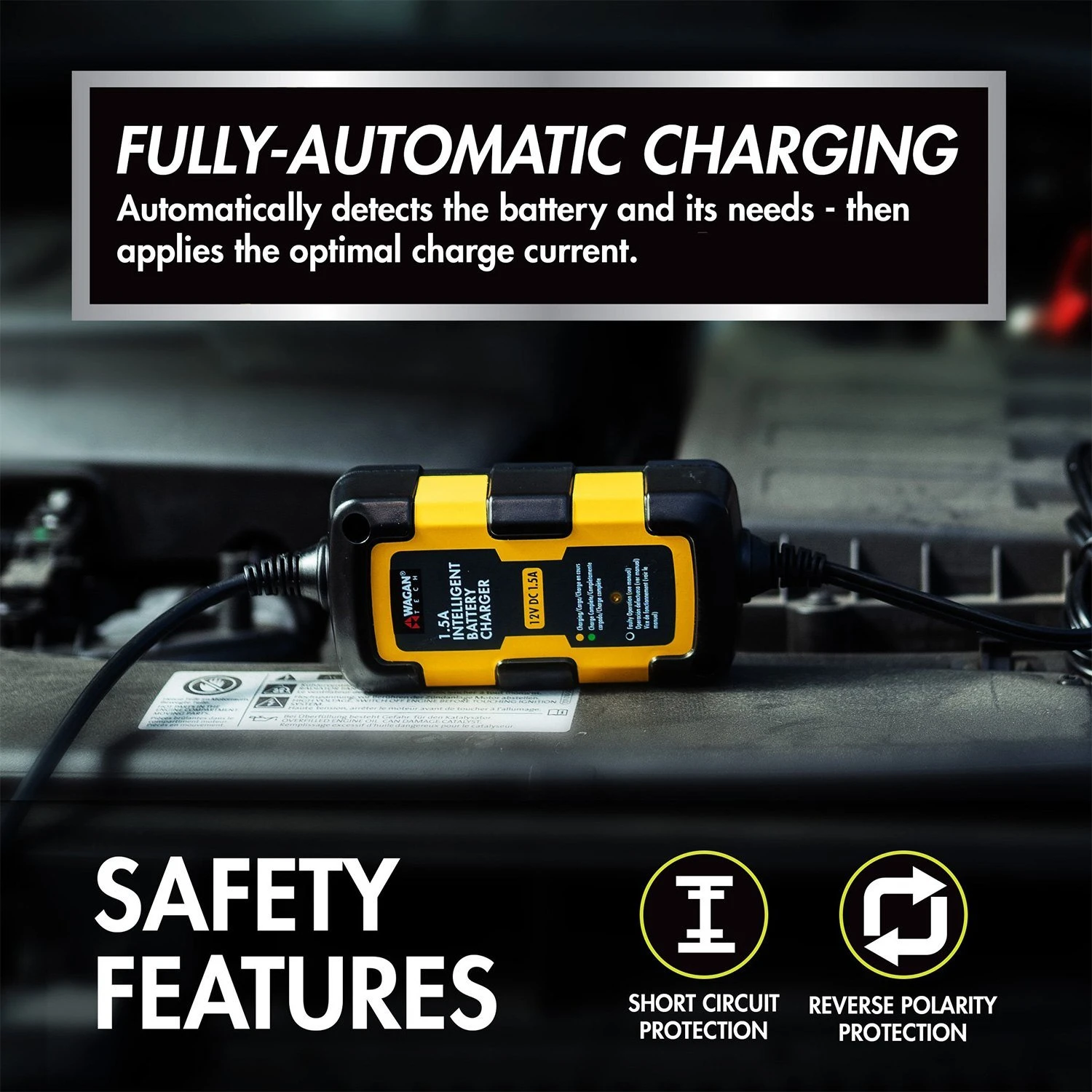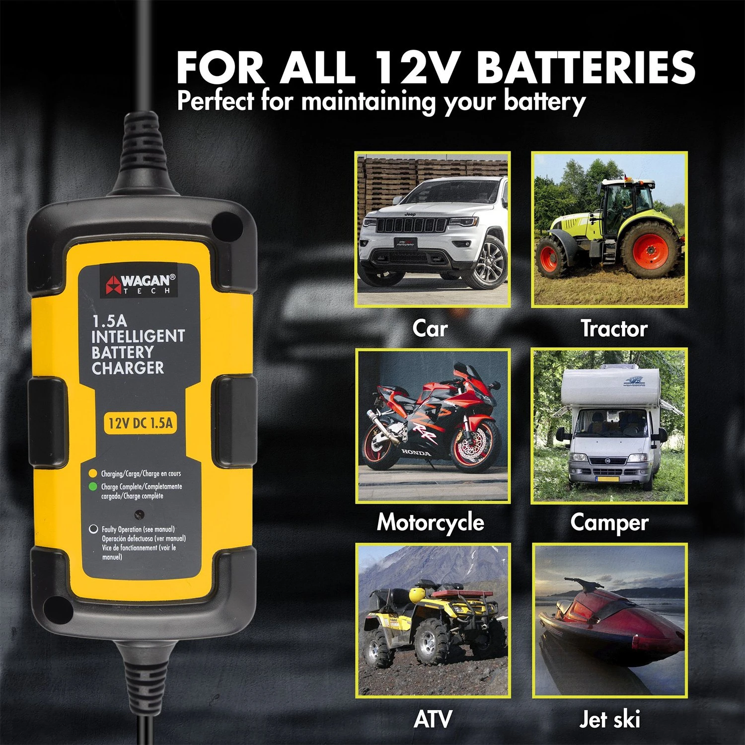 12 V Intelligent Fully Automatic Battery Charger and Maintainer (7402) by Wagan®. This Intelligent Chargers feature internal circuitry which detects the battery type, current battery charge, overall battery condition, and automatically responds to optimize charging for that specific battery. Ideally Suited for Your Needs: This 1.5A Intelligent Battery Charger is perfect for maintaining your battery especially when it will not be used for an extended time. Such applications include: ATVs, Snowmobiles, Motorcycles, Watercraft (boats, jetski, etc.), Trailers, RVs, Ride-on Lawnmowers, Tractors, Classic Cars, Auxiliary Batteries, Back-up power supply, Solar Battery, and more!