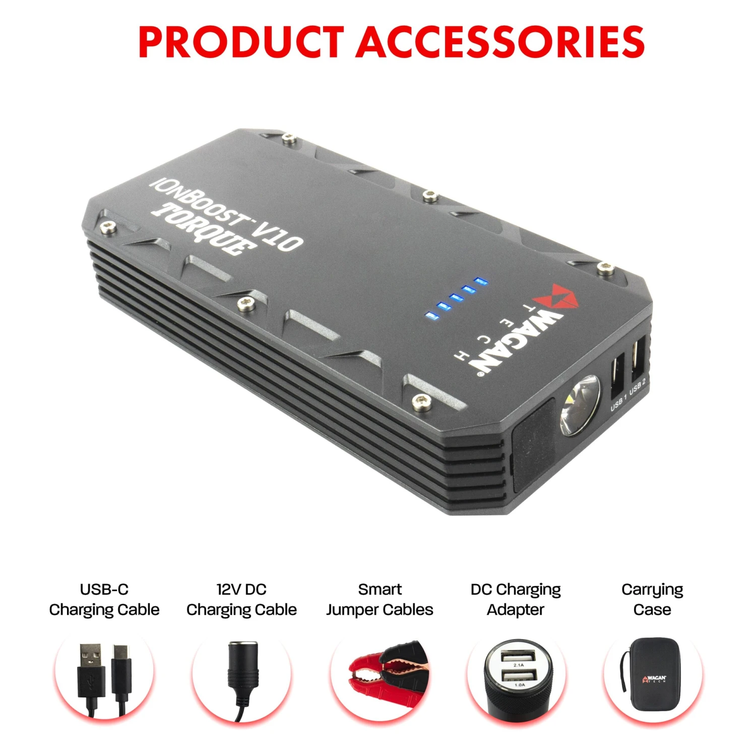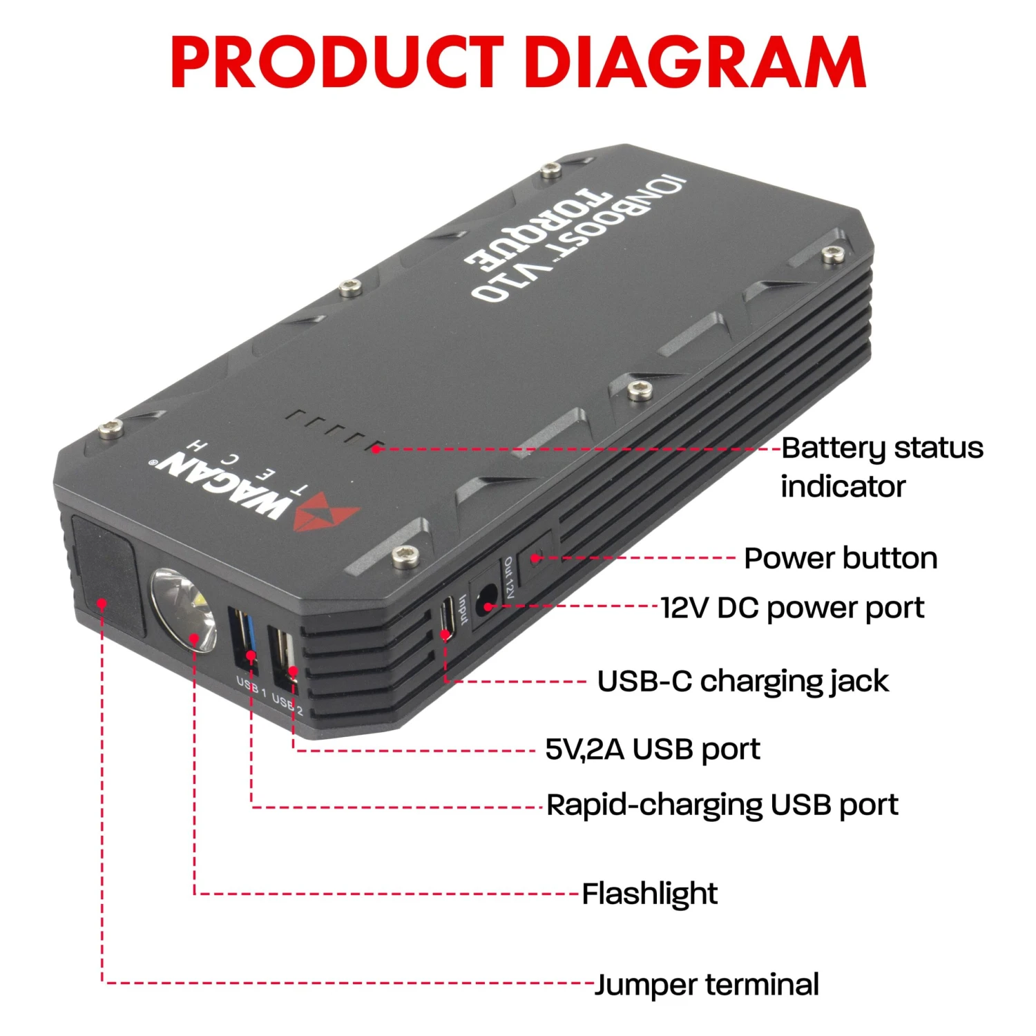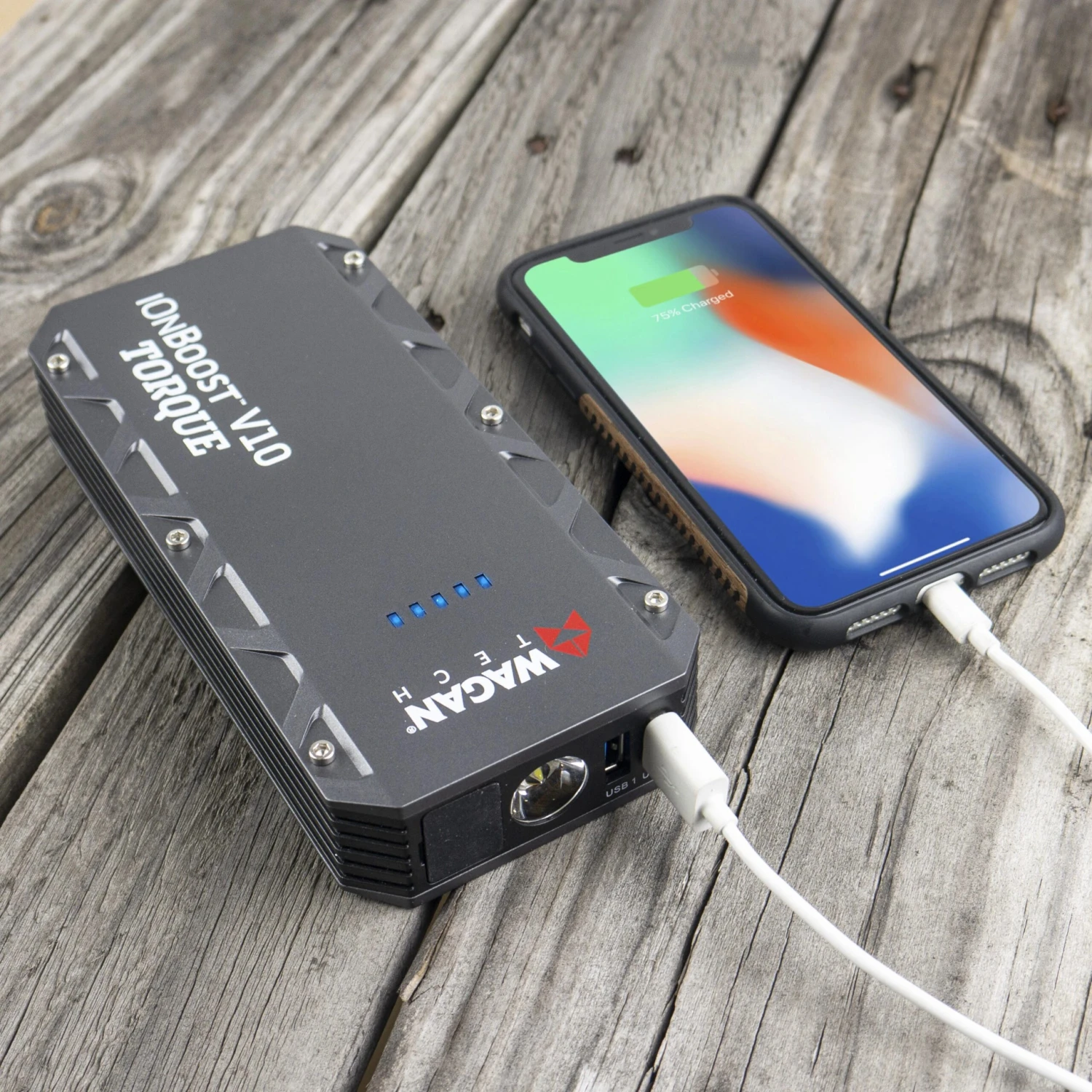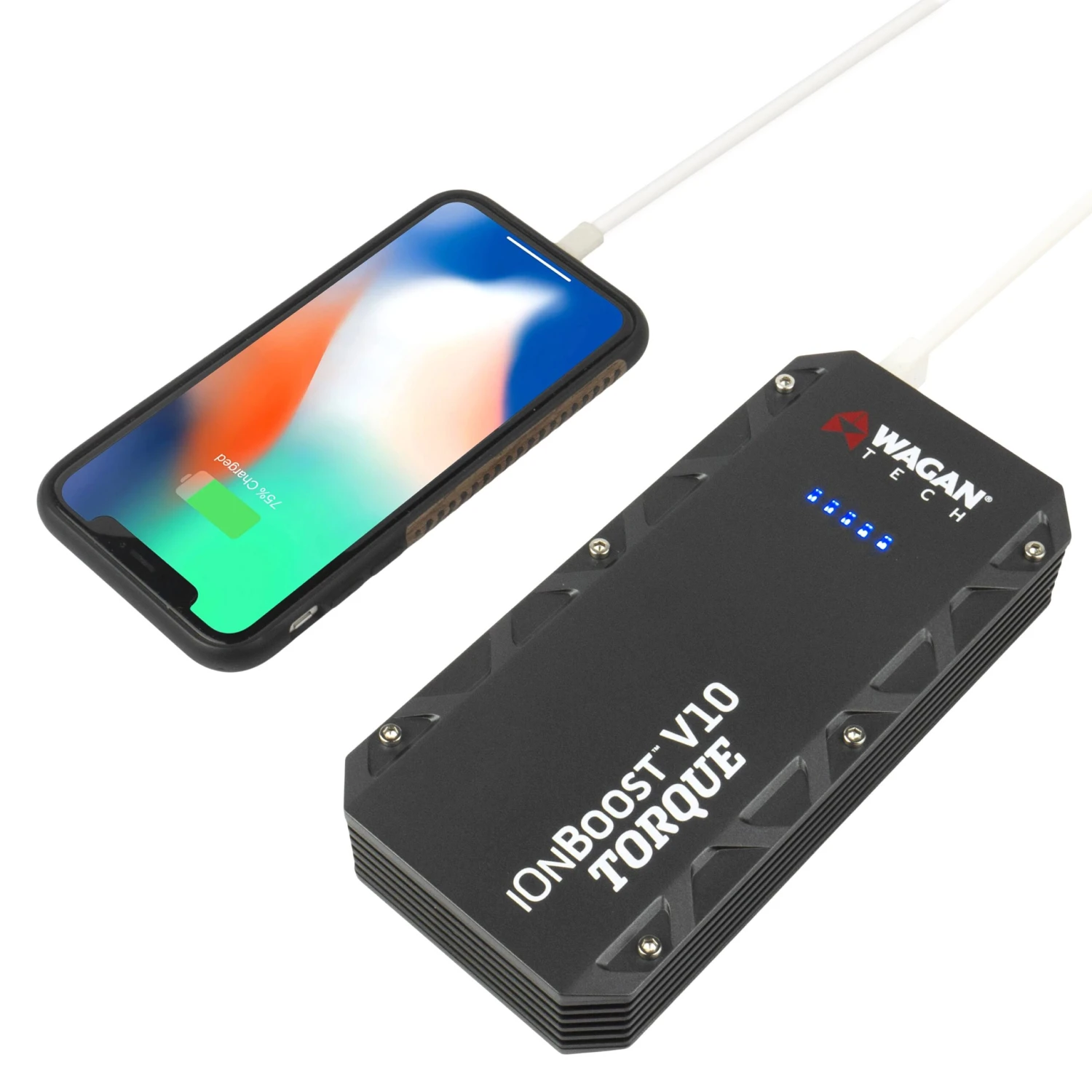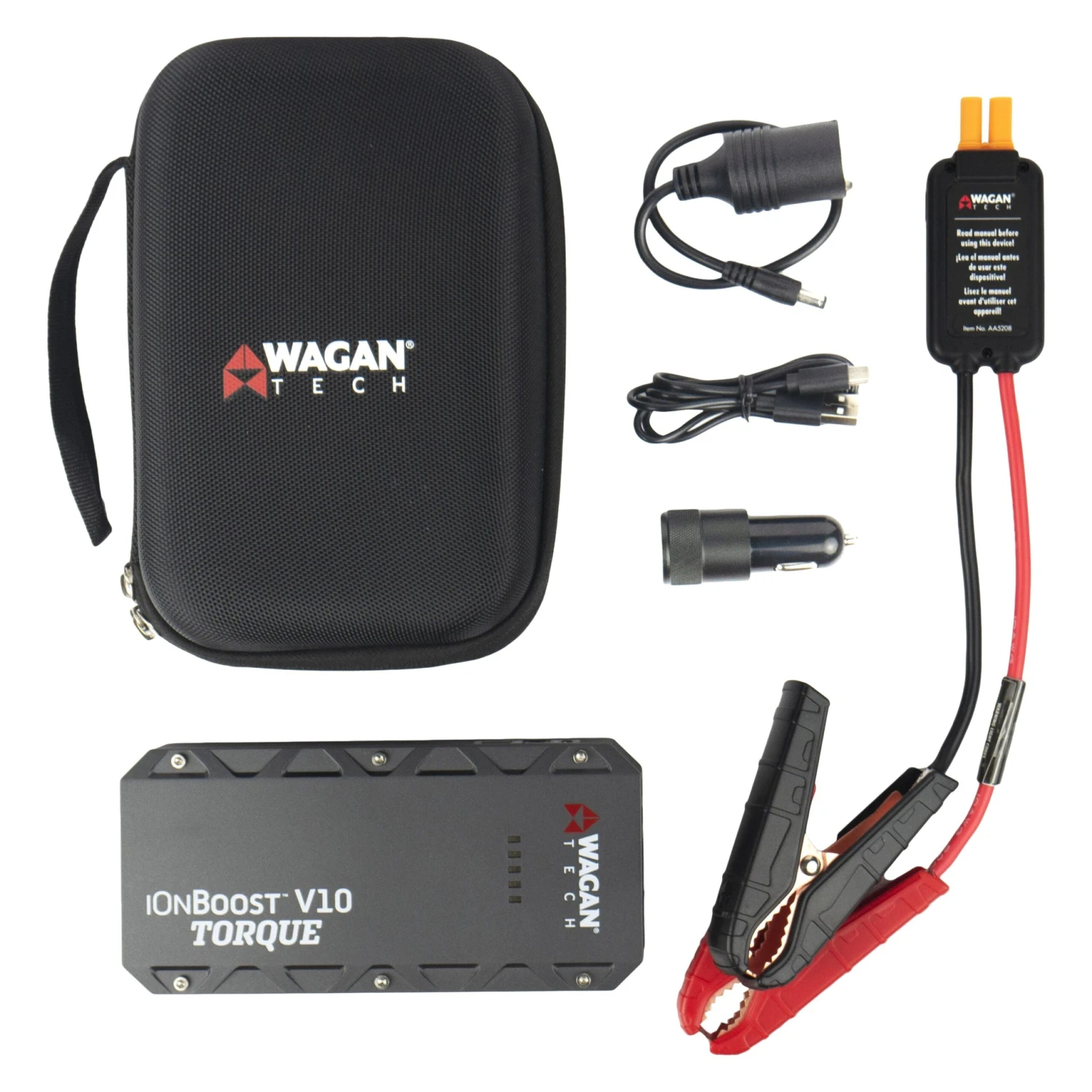 iOnBoost™ V10 14.8 V Compact Torque Jump Starter with Flashlight by Wagan®. This top-grade product is expertly made in compliance with stringent industry standards to offer a fusion of a well-balanced design and high level of craftsmanship. Manufactured from industry-leading materials using up-to-date equipment, it ensures everlasting reliability and enduring value. This product is distinguished by total quality assurance, unsurpassed by anybody else.