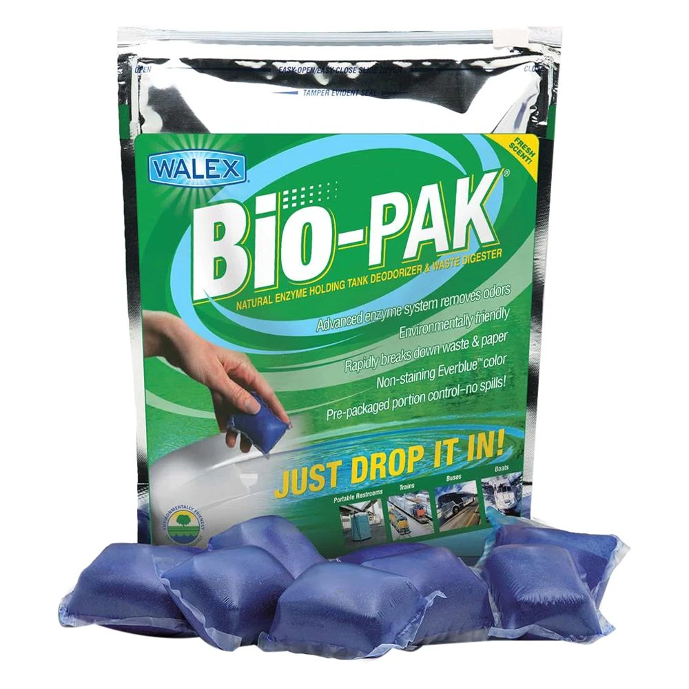 Bio-Pak™ Fresh Natural Enzyme Holding Tank Deodorizer & Waste Digester (50 Pieces) by Walex®. Environmentally friendly portion control deodorizer that starts to control odors immediately! Bio-Pak deodorizing packets are the result of the Walex R&D Group’s extensive research into discovering new, highly effective natural enzymes to control odor and liquefy waste.