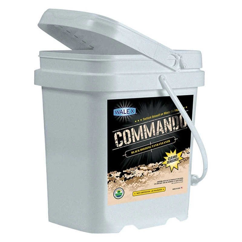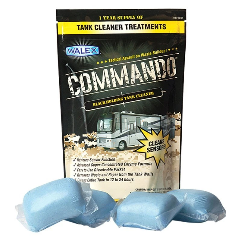 Commando™ 1.7 oz. Black Holding Tank Treatment (4 Pieces) by Walex®. Experiencing false readings from your sensors, or a continuous odor from your black holding tank? If so, you most likely have residual waste buildup on your holding tank interior walls and level sensors. Using Commando™ Black Holding Tank Cleaner will remove the odors and sensor buildup in as little as 12 hours.
