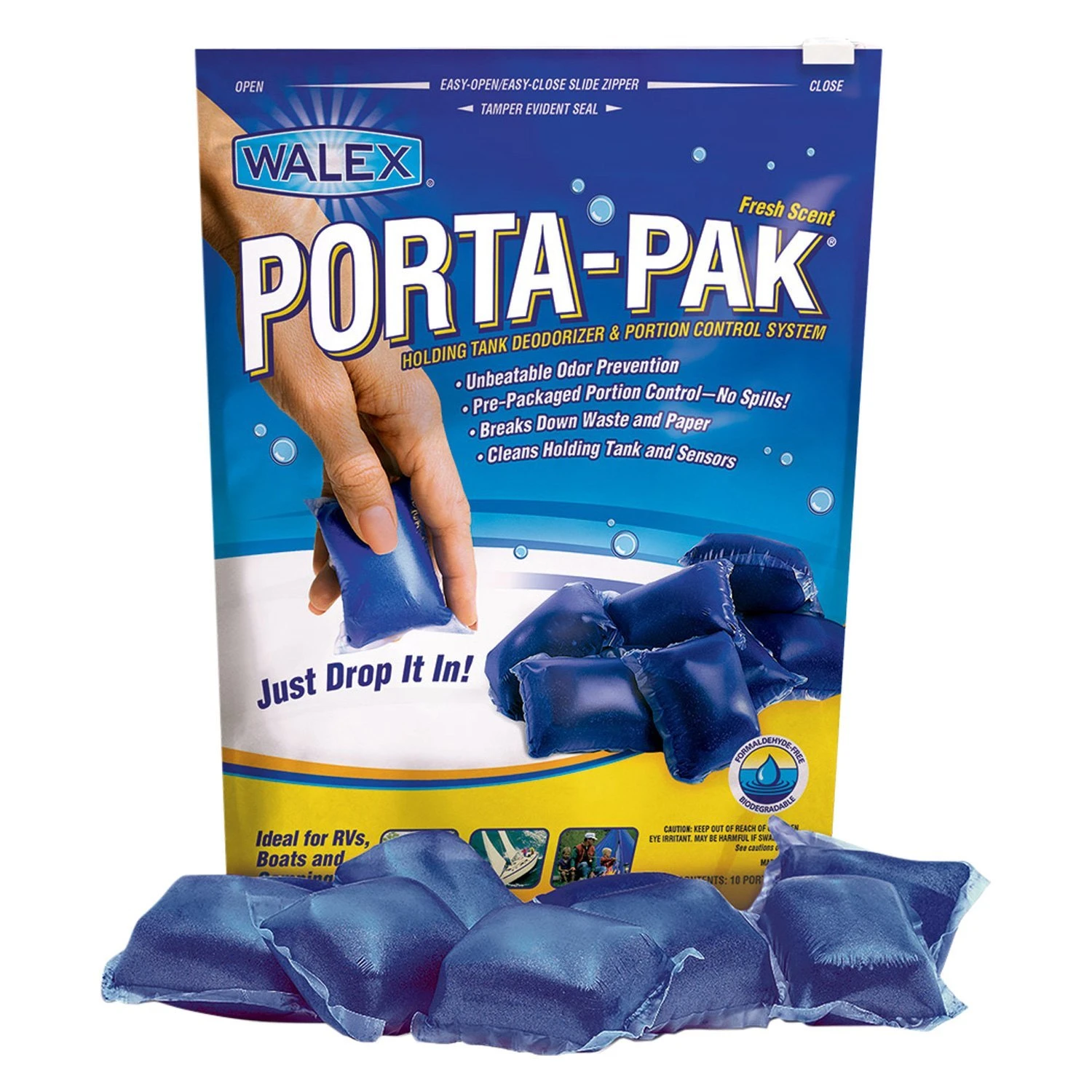 Porta-Pak™ 1.7 oz. Fresh Holding Tank Treatment (10 Pieces) (PPRV10) by Walex®. Never deal with a messy liquid again! The #1 portion control product around the world. The pre-packaged water-soluble packet controls odors, breaks down waste and paper, and lubricates valves and seals. Just drop it in!