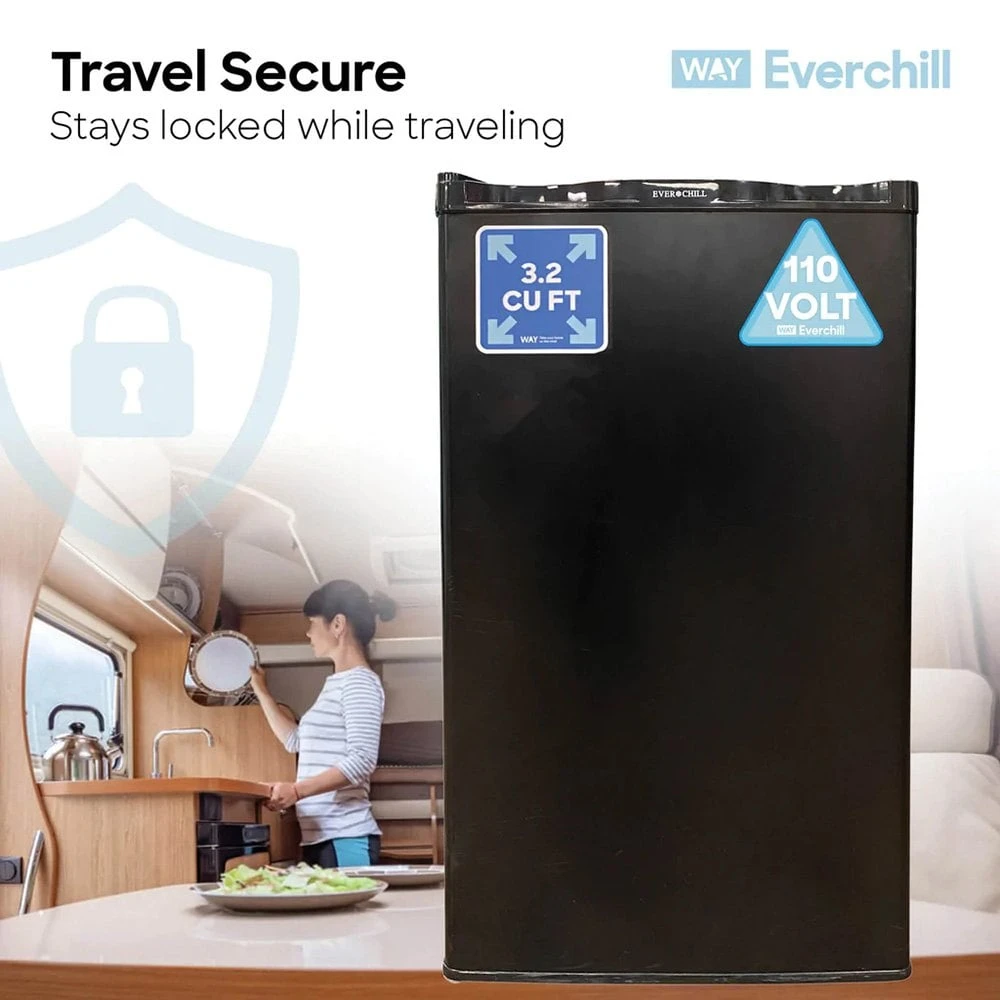 The Everchill by Way 3.2 Cubic Foot 110 Volt Refrigerator is UL listed and comes with a black finish to fit the aesthetics of any RV.