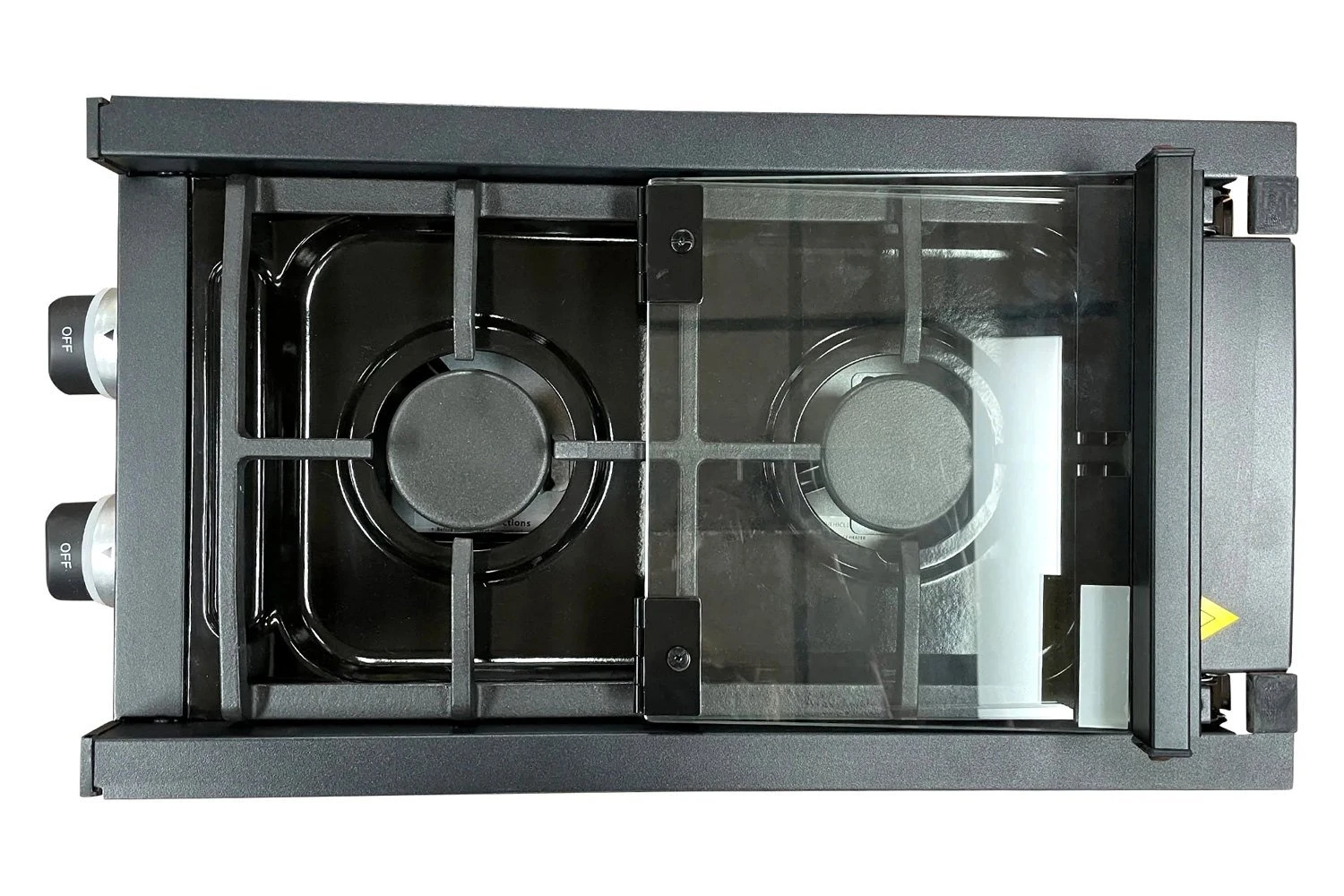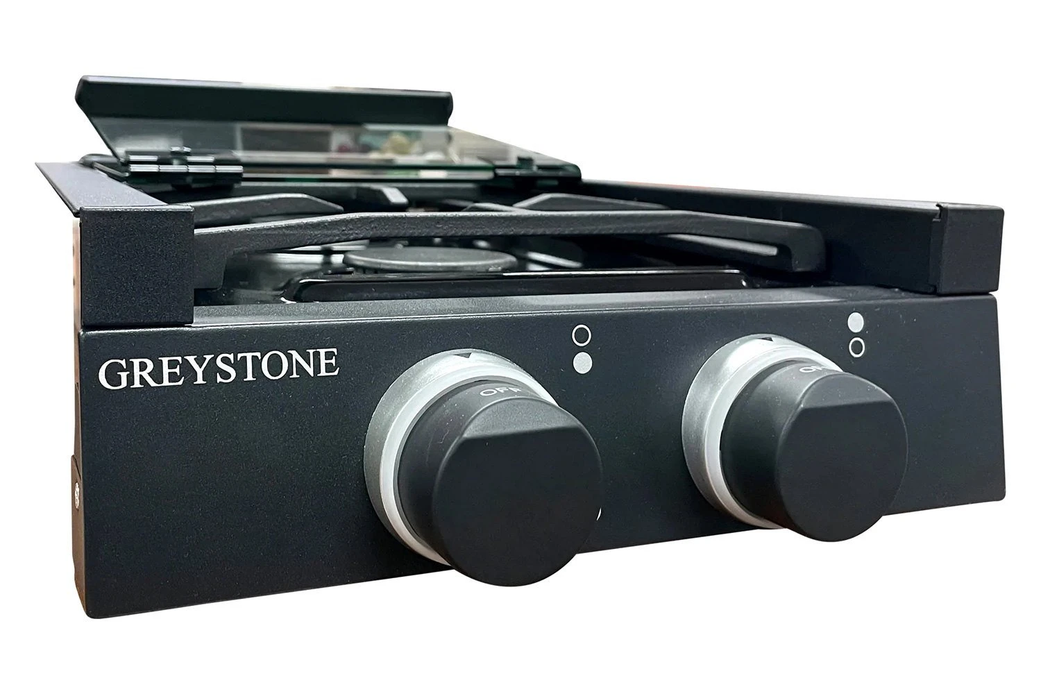 Greystone™ Premium Double Burner LP Gas Cooktop by Way Interglobal®. For Built-in Gas Cooking. Having the ability to cook your own food while on the road is a terrific perk of RVing. Not only is cooking your own food a money saver there are other benefits including saving time and providing healthier options than takeout or fast food. Sometimes, though, you don’t have enough room for a full oven or even for a microwave. In these situations, you can use other solutions like the Greystone Premium Double Burner Gas Cooktop. With cooktops, you may prepare meals over the stove without taking up additional cabinet room beneath it. Cooktops are an excellent way to add cooking capabilities to small pop-up campers.