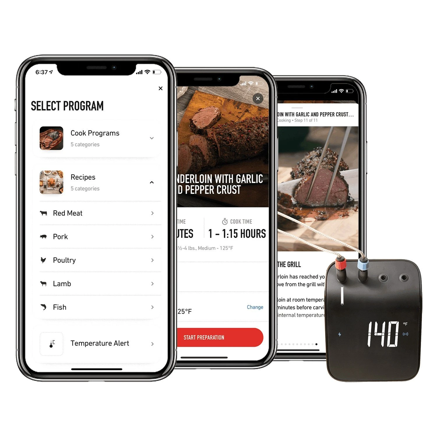 - Select doneness (medium-rare steak) and receive alerts when ready