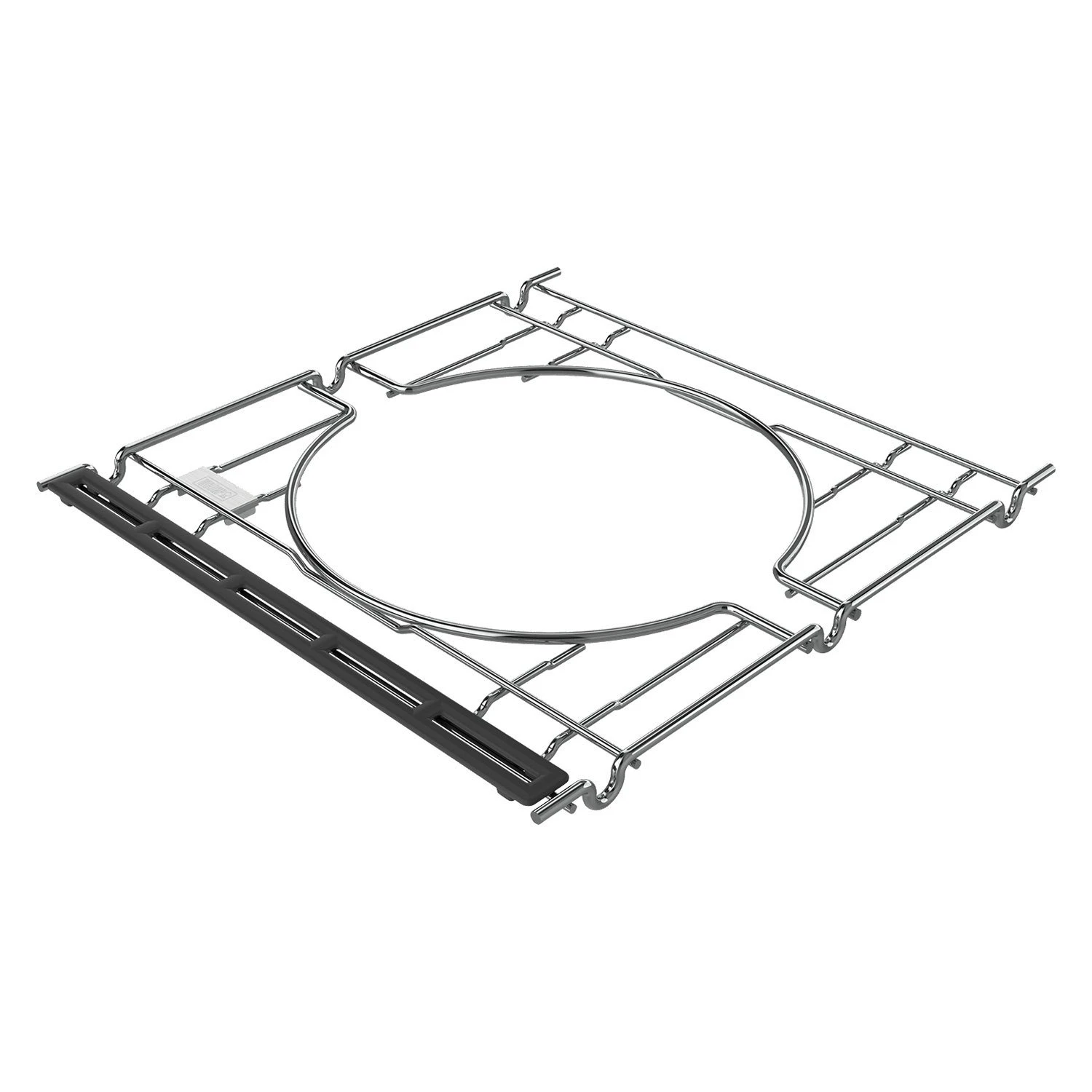 - Sits under the right-side cooking grate when not in use