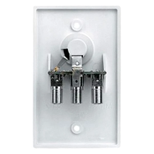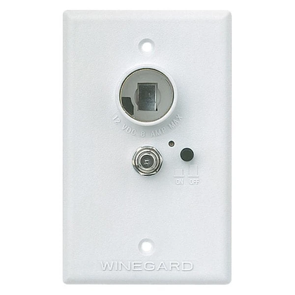7000 Series White Single TV Wall Plate (RV-7042) by Winegard®. A +12 VDC power supply with polyfuse in a flush mounted wall plate. Designed to provide the RV owner with the option of watching TV from a Winegard RV TV antenna or from an external source such as cable. Features include 75 ohm coaxial input/output connections, two-way splitter for 2nd TV, input switch for cable or TV antenna, select LED light and +12 VDC receptacle for TV set plug-in.
