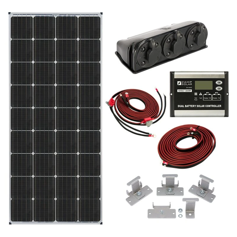 170W Dual Battery Bank Roof Solar Kit by Zamp Solar®. Built for RVs with dual battery banks, this kit’s 30 amp, 5-stage PWM charge controller can control two separate 12-volt battery banks-each with a different charging profile-independently. Expand this kit up to 510 watts for larger rigs or projects.